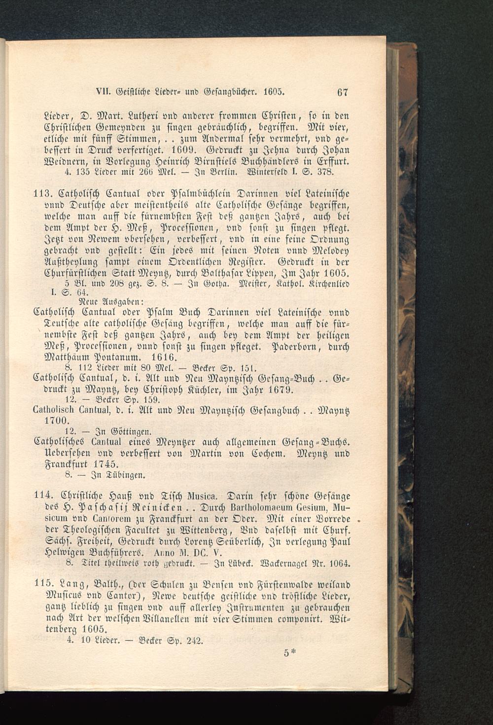 8. U2 Lieder mit 80 Mel. — Becker Sp. I5l.Catholisch Cantual, d. i. Alt und Neu Mayntzisch Gesang-Buch . . Ge-druckt zu Mayntz, bey Christoph Küchler, im Jahr 1679.12. — Becker Sp. 159.Lgllwlisel» e-mlusl, d. i. Alt und Neu Maynttisch Gesangbuch. . Mayntz1700.