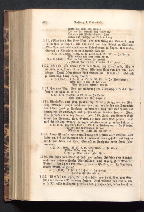1132. (Linck) Ein ncwes Liedt vom König auß Franckreych, Wie erein ende nam, Vnnd ist im Thon, Wie man singt von der Stat Lut-tringen. Durch Hieronimum Linck Glatzensum. Am Ende: Gedrucktzu Nürnberg , durch Georg Merckel.