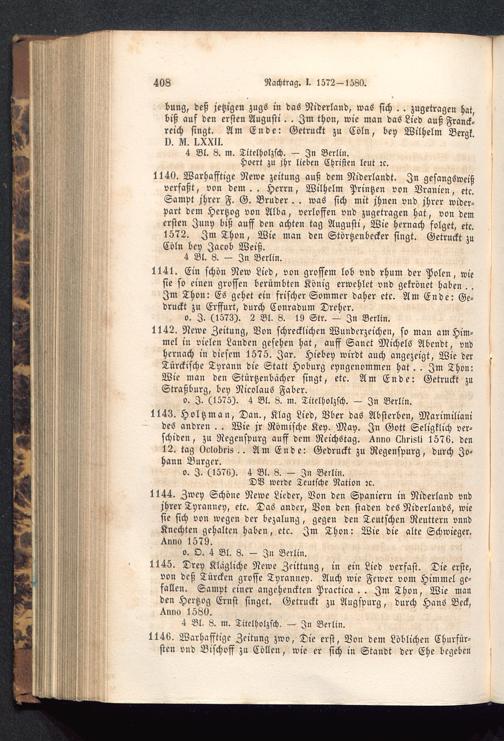 1140. Warhafftige Newe zeitung auß dem Niderlandt. In gesangswcißverfaßt, von dem.. Herrn, Wilhelm Printzen von Vranien, etc.Sampt jhrer F. G. Bruder. . was sich mit jhnen vnd jhrer Wider-part dem Hcrtzog von Alba, verlosten vnd zugetragen hat, von demersten Juny biß auff den achten tag Augusti, Wie hernach folget, etc.1572. Im Thon, Wie man den Störtzcnbecker singt. Getruckt zuCöln bey Jacob Weiß.