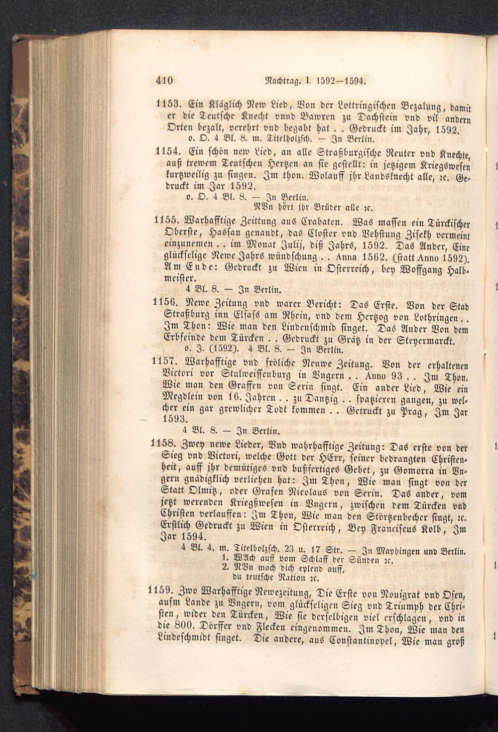 1158. Zwey newe Lieder, Vnd wahrhafftige Zeitung: Das erste von derSieg vnd Victori, welche Gott der HErr, seiner bedrängten Christen-heit, auff jhr demütiges vnd bußfertiges Gebet, zu Gomorra in Vn-gern gnadigklich verliehen hat: Im Thon, Wie man singt von derStatt Olmitz, oder Grafen Nicolaus von Serin. Das ander, vomjetzt werendcn Kriegßwesen in Vngcrn, zwischen dem Türcken vndChristen verlausten: Im Thon, Wie man den Störtzenbechcr singt, :c.Erstlich Gedruckt zu Wien in Osterreich , Bey Franciscus Kolb, ImJar 1594.