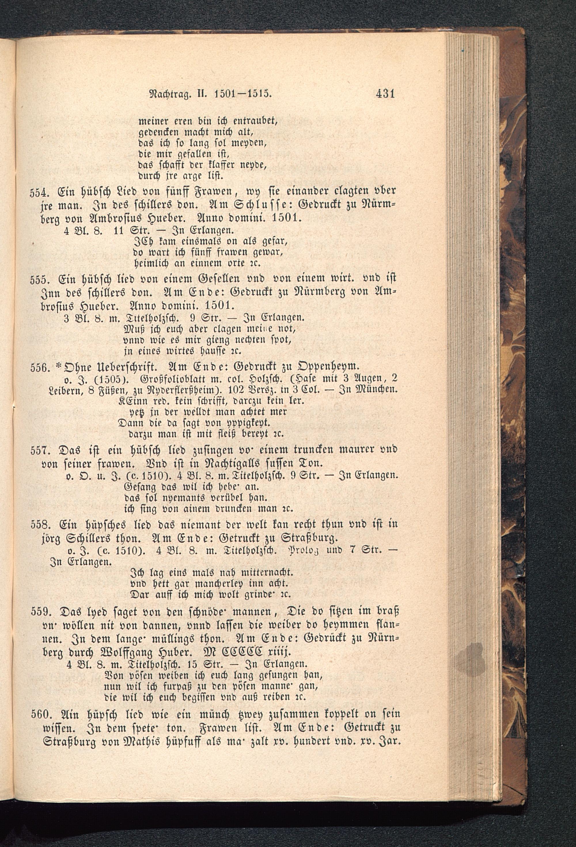 554. Ein hübsch Lied von fünff Frawen, wv sie einander clagten vbcrjre man. In des schillers don. Am Schlüsse: Gedruckt zu Nürm-berg von Ambrosius Hueber. Anno domini. 1501.
