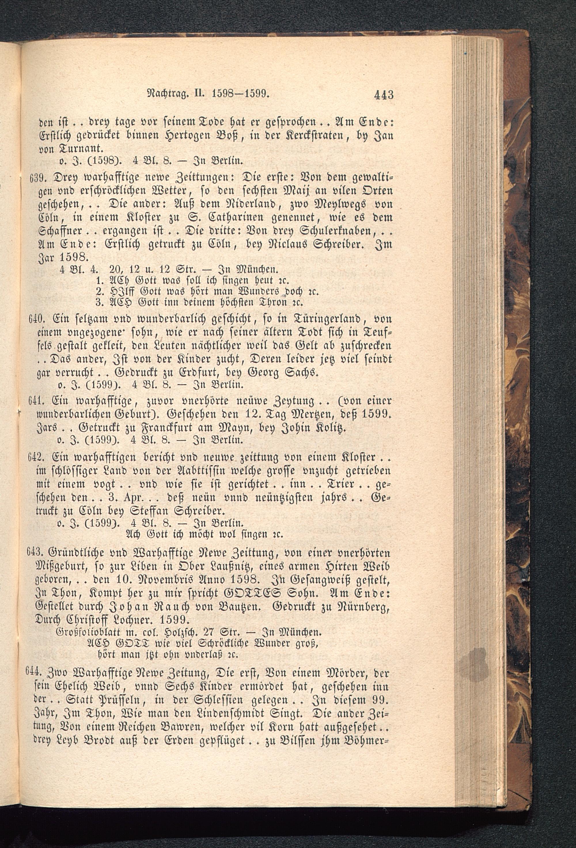 639. Drey warhafftige newe Zeittungen: Die erste: Von dem gewalti-gen vnd erschröcklichen Wetter, so den sechsten May an vilen Ortengeschehen, . . Die ander: Auß dem Niderland, zwo Meylwegs vonCöln, in einem Kloster zu S. Catharinen genennet, wie es demSchaffner. . ergangen ist. . Die dritte: Von drey Schulerknaben, . .Am Ende: Erstlich getruckt zu Cöln, bey Niclaus Schreiber. ImJar 1598.