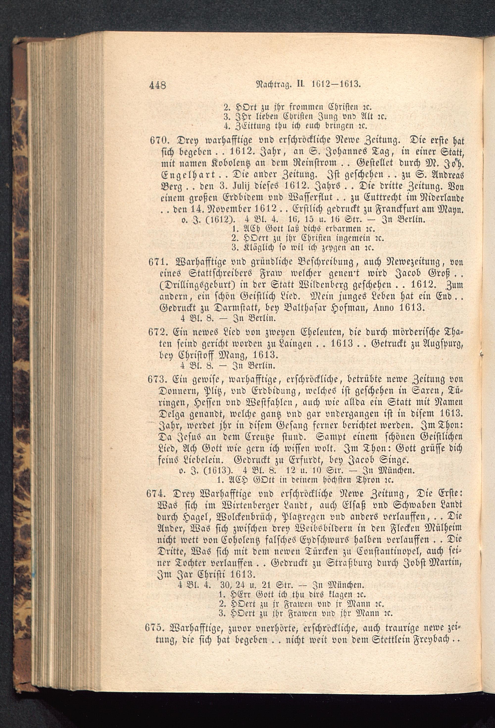670. Drey warhafftige vnd erschreckliche Newe Zeitung. Die erste hatsich begeben. . 1612. Jahr, an S. Johannes Tag, in einer Statt,mit namcn Koboleutz an dem Neinstrvm . . Gestellct durch M. Jo'h.Engelhart .. Die ander Zeitung. Ist geschehen . . zu S. AndreasBerg . . den 3. >IuI^ dieses 1612. Jahrs . . Die dritte Zeitung. Voneinem großen Erdbidem vnd Wasserflut . . zu Euttrecht im Niderlande. . den 14. November 1612 .. Erstlich gedruckt zu Francksurt am Mayn.