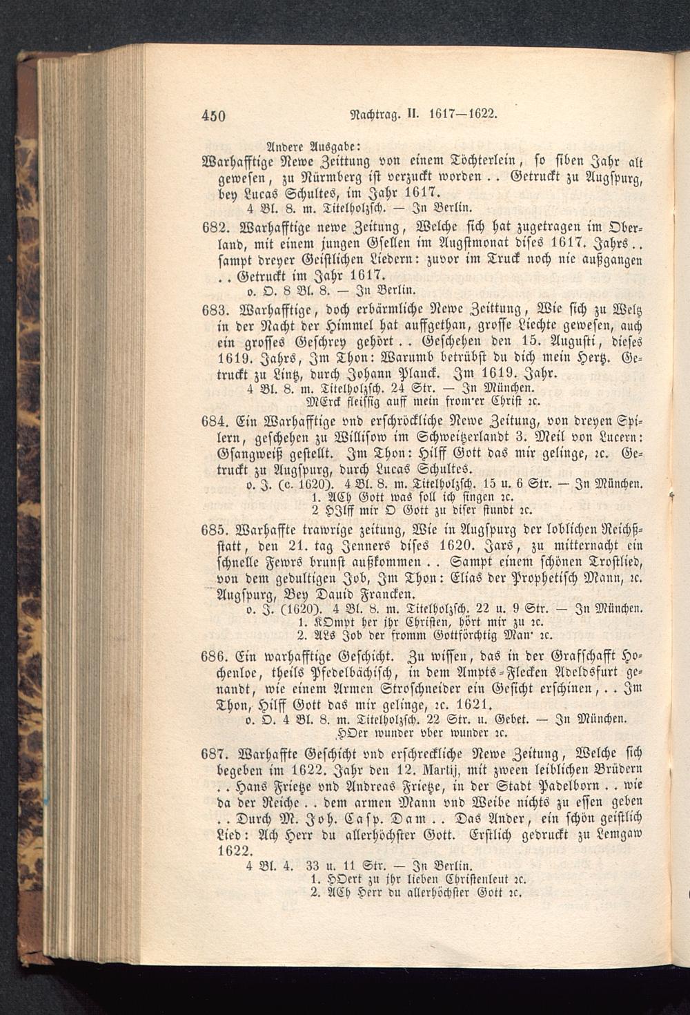 o. O. 8 Bl. 8. — In Berlin .633. Warhafftige, doch erbärmliche Newe Zeittung, Wie sich zu Wetzin der Nacht der Himmel hat auffgethan, grosse Liechte gewesen, auchein grosses Geschrey gehört.. Geschehen den 15. Augusti, dieses1619. Jahrs, Im Thon: Warumb betrübst du dich mein Hertz. Ge-truckt zu Lintz, durch Johann Planck . Im 1619. Jahr.4 Bl. 8. m. Titelholzsch. 24 Str. — In München .