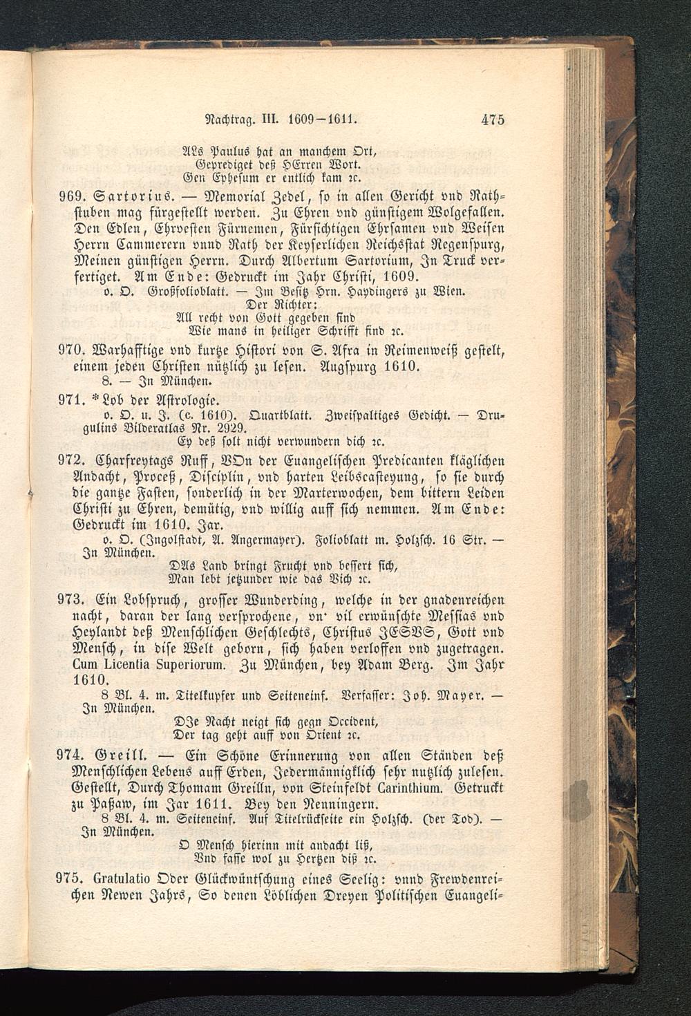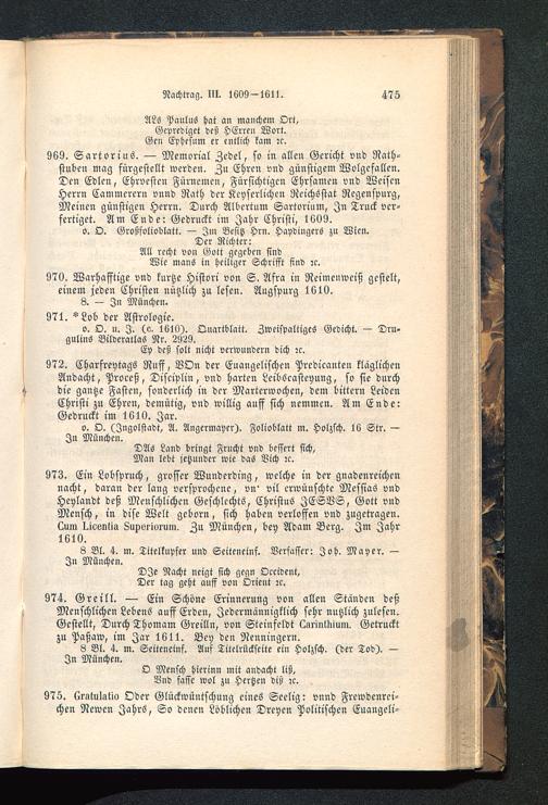 969. Sartor ins. — Memorial Zedel, so in allen Gericht vnd Nath-stuben mag fürgestcllt werden. Zu Ehren vnd günstigem Wolgcfallen.Den Edlen, Ehrvesten Fürnemcn, Fürsichtigen Ehrsamen vnd WeisenHerrn Cammerern vnnd Rath der Kcyserlichen RcichSstat Regenspurg,Meinen günstigen Herrn. Durch Albertum Sartorium, In Truck ver-fertiget. Am Ende: Gedruckt im Jahr Christi, 1609.