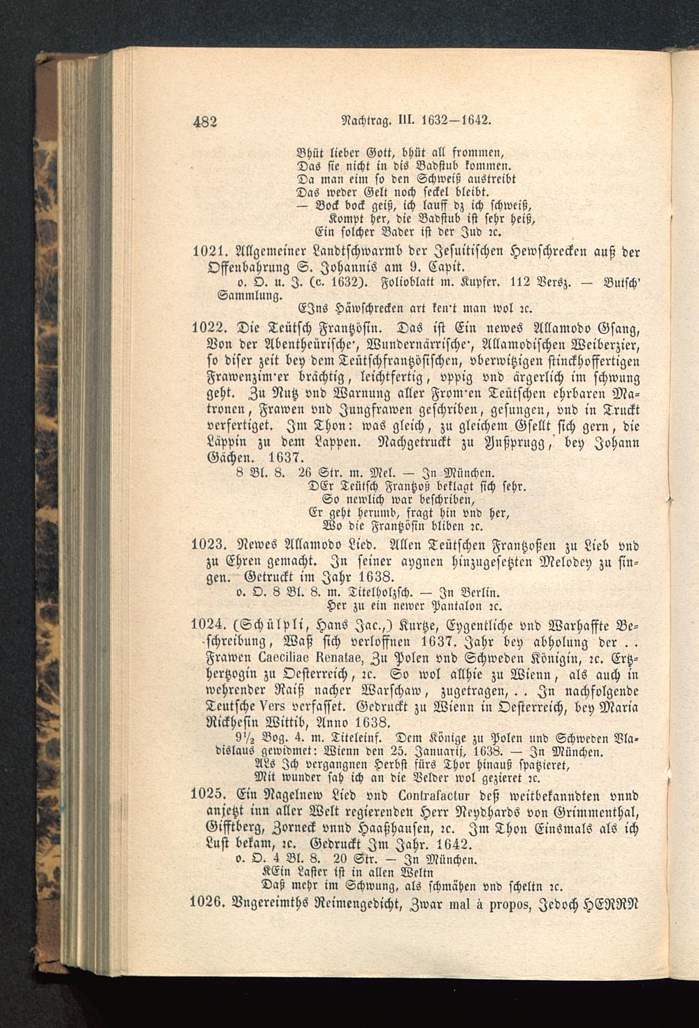 1022. Die Teutsch Frantzösin. Das ist Ein newes Allamodo Gsang,Von der Abenthcürische', Wundernärrischc', Allamodischen Weiberzier,so discr zeit bey dem Tcütschfrantzösischcn, vberwitzigen stinckhoffertigenFrawcnzim'er brächtig, leichtfertig, vppig vnd ärgerlich im schwunggeht. Zu Nutz vnd Warnung aller Fronten Teutschen ehrbaren Ma-tronen, Frawen vnd Jungfrawen geschriben, gesungen, vnd in Trucktverfertiget. Im Thon: was gleich, zu gleichem Gsellt sich gern, dieLäppin zu dem Lappen. Nachgctruckt zu Anßprugg,' bey JohannGächen. 1637.