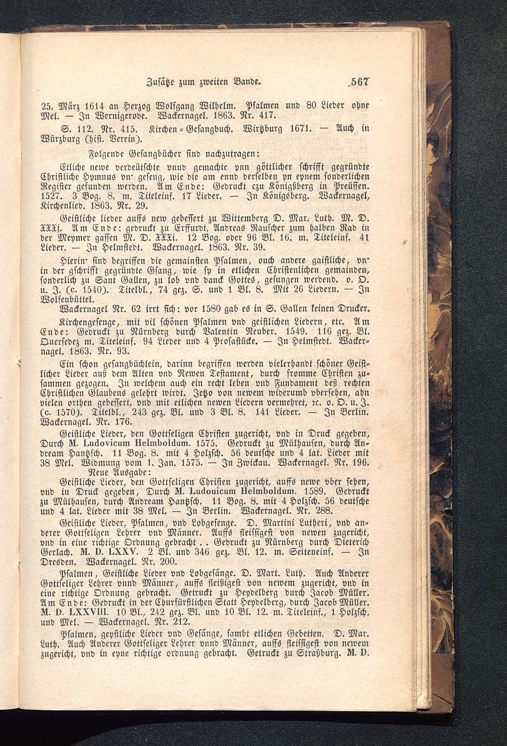 Geistliche Lieder, Psalmen, vnd Lobgesenge. D. Martini Lutheri, vnd an-derer Gottseligen Lehrer vnd Männer. Auffs fleissigest von newen zugericht,vnd in eine richtige Ordnung gebracht. . Gedruckt zu Nürnberg durch DieterichGerlach. U. 0. 1.XXV. 2 Bl. und 346 gez. Bl. 12. m. Seiteneinf. — InDresden . Wackernagel. Nr. 200.