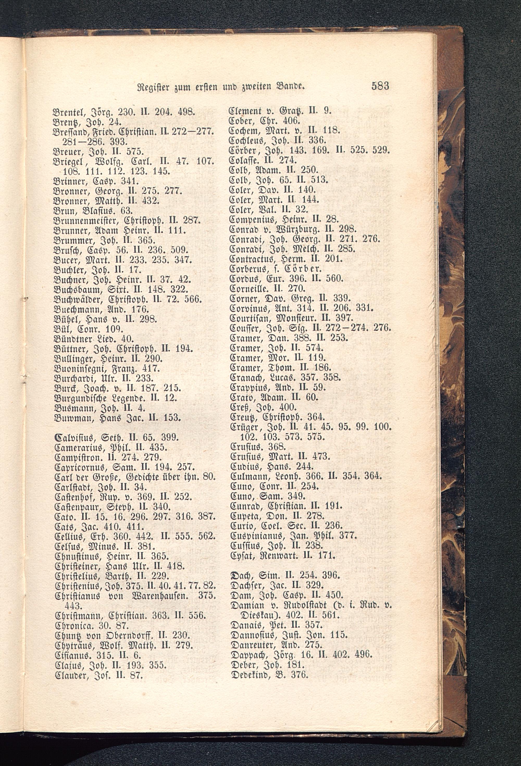 Calvisius, Seth. II, 65. 399.Camcrarius, Phil. II, 435.Campistron. II. 274. 279.Capricornus, Sam. II. 194. 257.Carl der Große, Gedichte über ihn. 80.Carlstadt, Joh. II. 34.Castenhof, Rup. v. 369. II. 252.Castenpaur, Steph. II. 340.Cato. II- 15. 16. 296. 297. 316. 387.Cats, Jac. 410. 411.Ccllius, Erh. 360. 442. II. 555. 562.Celsus, Minus. II. 381.Chnustinus, Heinr. II, 365.Christeiner, Hans Ulr. II, 418.Christelius, Barth. II. 229.Christcnius, Joh . 375. II, 40.41.77.82.Christianus von Warenhausen. 375.443.