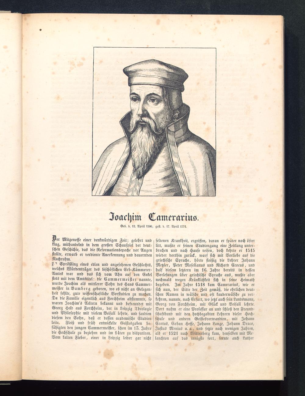 Ein Sprößling eines edlen und angesehenen Geschlechts,welches Würdenträger des bischöflichen Erb-Kämmerer-Amtes war und das sich vom Ahn auf den Enkelstets mit dem Amtstitel: die Cammermeister nannte,wurde Joachim als mittlerer Sohn des Hans Cammer-meister inBamberg geboren, wo es nicht an Gelegen-heit fehlte, gute wissenschaftliche Vorstudien zu machen.Da die Familie eigentlich aus Forchhcim abstammte, sowaren Joachim's Aeltern bekannt und befreundet mitGeorg Held aus Forchheim, der in Leipzig Theologieund Philosophie mit vielem Beifall lehrte, und sandtendiesem den Sohn, daß er dessen akademische Studienleite. Fleiß und früh entwickelte Geistesgaben be-fähigten den jungen Cammermeister, schon im 13. Jahredie Hochschule zu beziehen und im leiten zu disputiren.Vom kalten Fieber, einer in Leipzig leider gar nicht