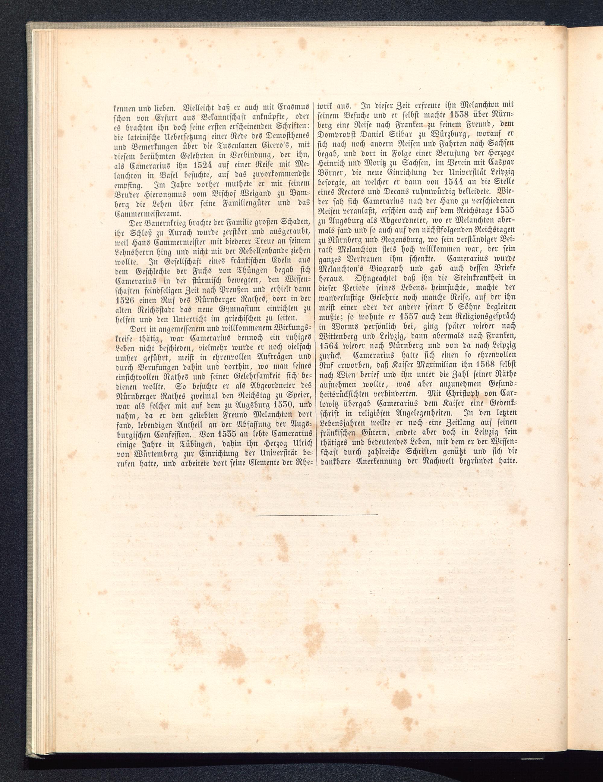 torik aus. In dieser Zeit erfreute ihn Melanchton mitseinem Besuche und er selbst machte 1538 über Nürn-berg eine Reise nach Franken zu seinem Freund, demDompropst Daniel Stibar zu Würzburg , worauf ersich nach noch andern Reisen und Fahrten nach Sachsenbegab, und dort in Folge einer Berufung der HerzogeHeinrich und Moritz zu Sachsen, im Verein mit CasparBörncr, die neue Einrichtung der Universität Leipzig besorgte, an welcher er dann von 1544 an die Stelleeines Rectors und Decans ruhmwürdig bekleidete. Wie-der sah sich Camcrarius nach der Hand zu verschiedenenReisen veranlaßt, erschien auch auf dem Reichstage 1555zu Augsburg als Abgeordneter, wo er Melanchton aber-mals fand und so auch auf den nächstfolgenden Reichstagenzu Nürnberg und Regensburg , wo sein verständiger Bei-rath Melanchton stets hoch willkommen war, der seinganzes Vertrauen ihm schenkte. Camcrarius wurdeMelanchton's Biograph und gab auch dessen Brieseheraus. Ohngcachtct daß ihn die Steinkrankheit indieser Periode seines Lebens- heimsuchte, machte derwanderlustige Gelehrte noch manche Reise, auf der ihnmeist einer oder der andere seiner 5 Söhne begleitenmußte; so wohnte er 1557 auch dem Religionsgesprächin Worms persönlich bei, ging später wieder nachWittenberg und Leipzig, dann abermals nach Franken ,1564 wieder nach Nürnberg und von da nach Leipzig zurück. Camcrarius hatte sich einen so ehrenvollenRuf erworben, daß Kaiser Maximilian ihn 1568 selbstnach Wien berief und ihn unter die Zahl seiner Rätheaufnehmen wollte, was aber anzunehmen Gesund-heitsrücksichten verhinderten. Mit Christoph von Car-lowitz übergab Camcrarius dem Kaiser eine Gedenk-schrift in religiösen Angelegenheiten. In den letztenLebensjahren weilte er noch eine Zeitlang auf seinenfränkischen Gütern, endete aber doch in Leipzig seinthätiges und bedeutendes Leben, mit dem er der Wissen-schaft durch zahlreiche Schriften genützt und sich diedankbare Anerkennung der Nachwelt begründet hatte.