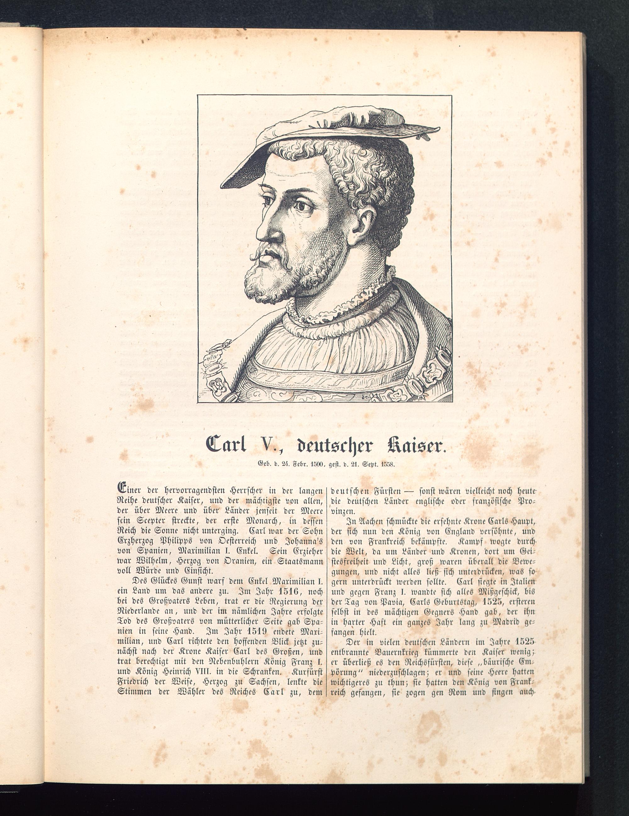 Einer der hervorragendsten Herrscher in der langenReihe deutscher Kaiser, und der mächtigste von allen,der über Meere und über Länder jenseit der Meeresein Scepter streckte, der erste Monarch, in dessenReich die Sonne nicht unterging. Carl war der SohnErzherzog Philipps von Oesterreich und Johanna'svon Spanien, Maximilian I. Enkel. Sein Erzieherwar Wilhelm, Herzog von Oranien, ein Staatsmannvoll Würde und Einsicht.