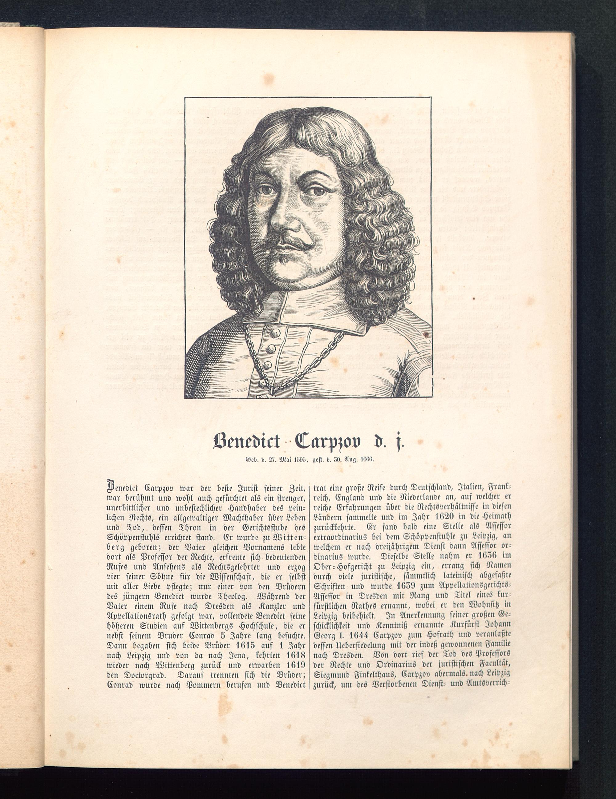 Benedict Carpzov war der beste Jurist seiner Zeit,war berühmt und wohl auch gefürchtet als ein strenger,unerbittlicher und unbestechlicher Handhaber des pein-lichen Rechts, ein allgewaltiger Machthaber über Lebenund Tod, dessen Thron in der Gerichtsstube desSchöppenstuhls errichtet stand. Er wurde zu Witten-berg geboren; der Vater gleichen Vornamens lebtedort als Professor der Rechte, erfreute sich bedeutendenRufes und Ansehens als Rechtsgelehrter und erzogvier seiner Sohne für die Wissenschaft, die er selbstmit aller Liebe pflegte; nur einer von den Brüderndes jüngern Benedict wurde Theolog. Während derVater einem Rufe nach Dresden als Kanzler undAppellationsrath gefolgt war, vollendete Benedict seinehöheren Studien auf Wittenbergs Hochschule, die ernebst seinem Bruder Conrad 5 Jahre lang besuchte.Dann begaben sich beide Brüder 1615 aus 1 Jahrnach Leipzig und von da nach Jena, kehrten 1618wieder nach Wittenberg zurück und erwarben 1619den Doctorgrad. Darauf trennten sich die Brüder;Conrad wurde nach Pommern berufen und Benedict