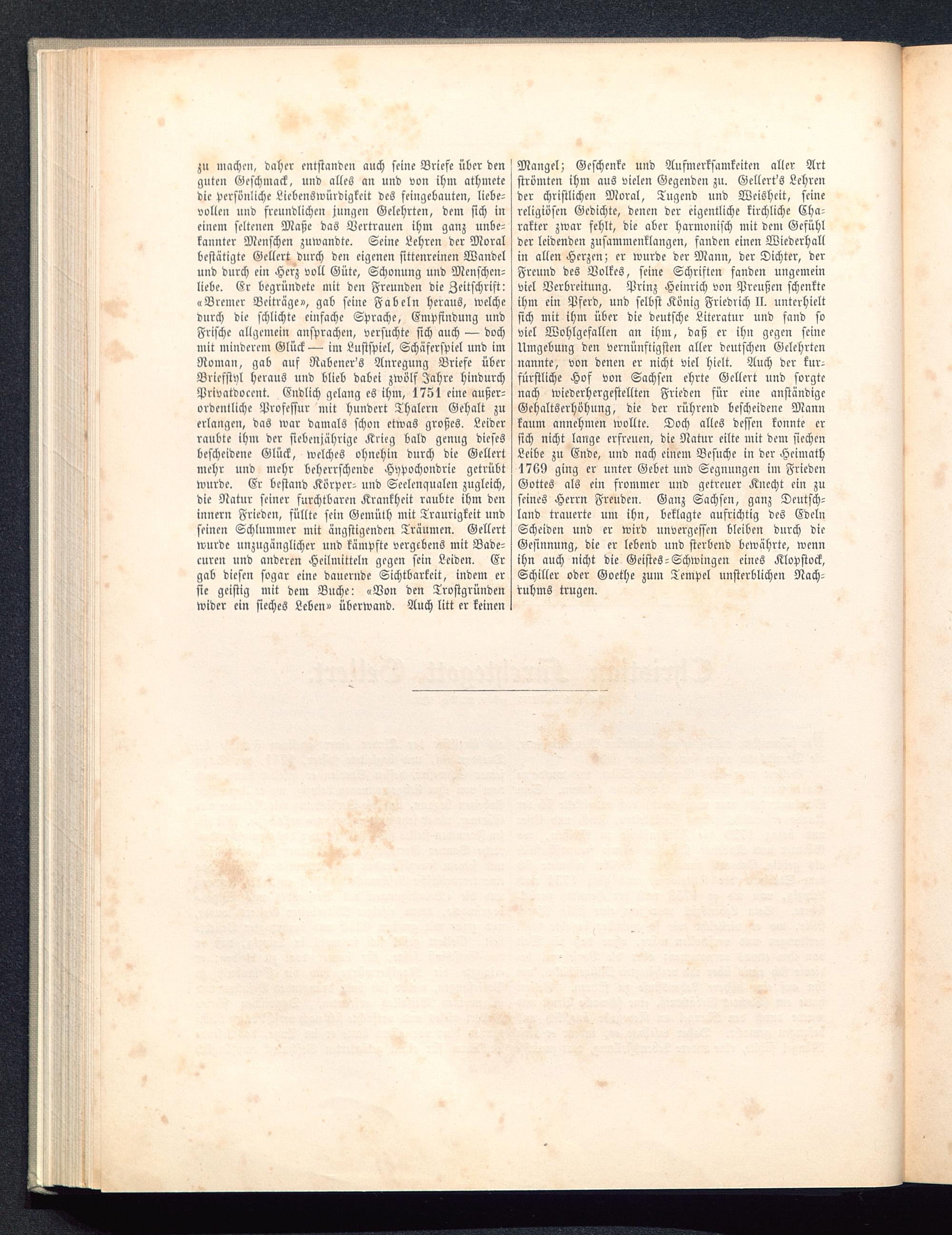 zu machen, daher entstanden auch seine Briefe über denguten Geschmack, und alles au und von ihm athmetedie persönliche Liebenswürdigkeit des feingebauten, liebe-vollen und freundlichen jungen Gelehrten, dem sich ineinem seltenen Maße das Vertrauen ihm ganz unbe-kannter Menschen zuwandte. Seine Lehren der Moralbestätigte Gellcrt durch den eigenen sittenreinen Wandelund durch ein Herz voll Güte, Schonung und Menschen-liebe. Er begründete mit den Freunden die Zeitschrift:«Bremer Beiträge», gab seine Fabeln heraus, welchedurch die schlichte einfache Sprache, Empfindung undFrische allgemein ansprachen, versuchte sich auch — dochmit minderem Glück — im Lustspiel, Schäferspiel und imNoman, gab auf Rabcner's Anregung Briefe überBricfstyl heraus und blieb dabei zwölf Jahre hindurchPrivatdocent. Endlich gelang es ihm, 1751 eine außer-ordentliche Professur mit hundert Thalern Gehalt zuerlangen, das war damals schon etwas großes. Leiderraubte ihm der siebenjährige Krieg bald genug diesesbescheidene Glück, welches ohnehin durch die Gellcrtmehr und mehr beherrschende Hypochondrie getrübtwurde. Er bestand Körper- und Seelenqualen zugleich,die Natur seiner furchtbaren Krankheit raubte ihm deninnern Frieden, füllte sein Gemüth mit Traurigkeit undseinen Schlummer mit ängstigenden Träumen. Gellcrtwurde unzugänglicher und kämpfte vergebens mit Bade-kuren und anderen Heilmitteln gegen sein Leiden. Ergab diesen sogar eine dauernde Sichtbarkeit, indem ersie geistig mit dem Buche: «Von den Trostgründenwider ein sieches Leben» überwand. Auch litt er keinen