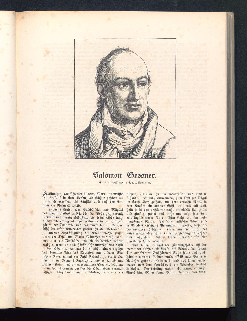 Geßner's Vater war Buchhändler und Mitglieddes großen Rathes in Zürich; der Sohn zeigte wenigLernlust und wenig Fähigkeit, die träumerische jungeDichterseele erging sich schon frühzeitig in den Blüthen-gärten der Phantasie und das dürre latein und grie-chisch des ersten Unterrichts stießen ihn ab und drängtenzu anderer Beschäftigung; der Knabe machte fleißigunter der Tafel aus Wachs Männchen und Thierchen,womit er die Mitschüler und die Geschwister daheimergötzte, wenn er auch häufig sehr unergvtzliches dafürin der Schule zu ertragen hatte; nicht minder ergötztedas heimliche Lesen des Robinson und anderer See-fahrer Fata, sammt der Insel Felsenburg, die Mode-schristen in Geßner's Jugendzeit, und er schrieb undzeichnete fleißig nach diesen erbaulichen Studien, währender in Gottes Namen darüber die Schulstudicn vernach-lässigte. Dieß durfte nicht so bleiben, er wurde der