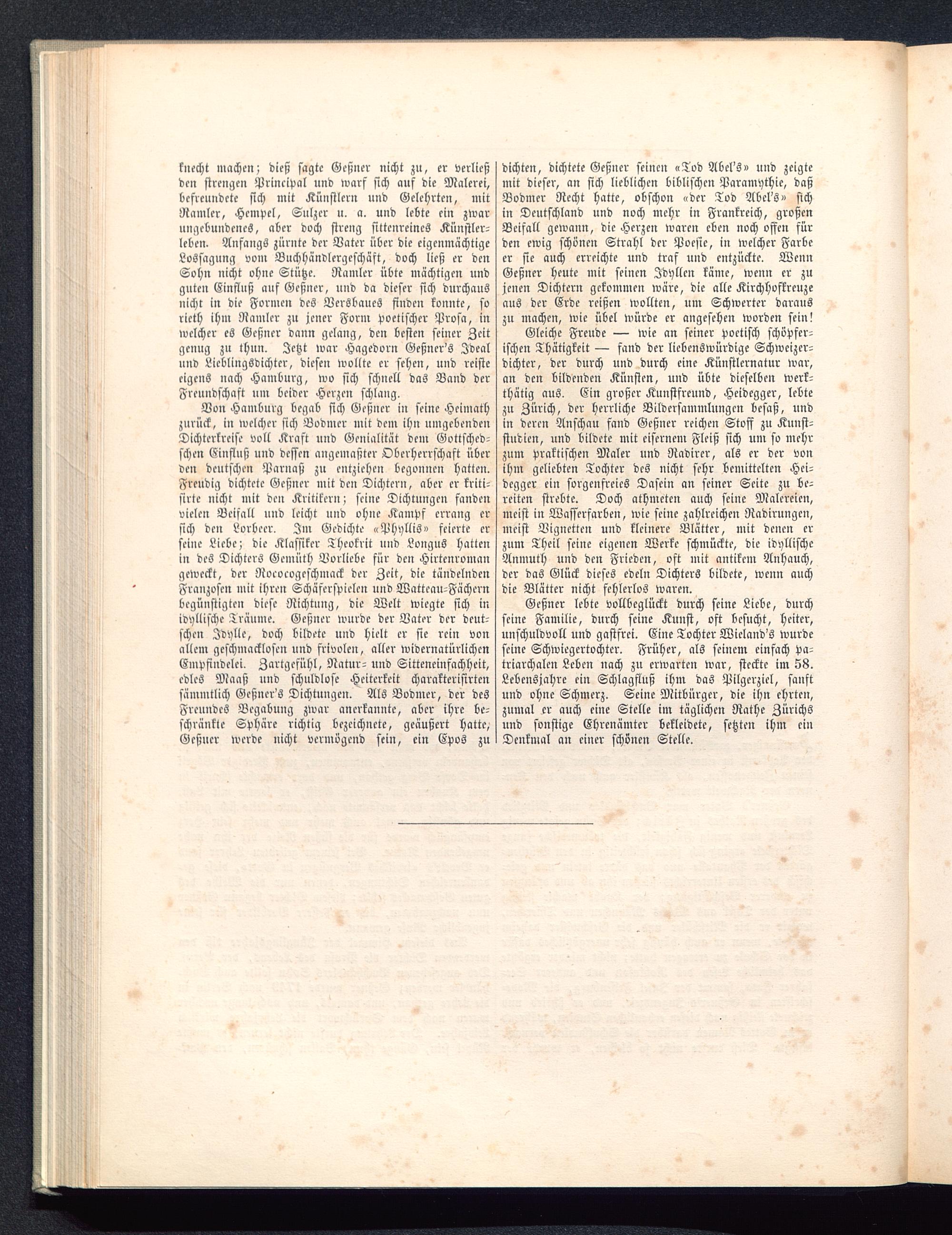 Geßner lebte vollbeglückt durch seine Liebe, durchseine Familie, durch seine Kunst, oft besucht, heiter,unschuldvoll und gastfrei. Eine Tochter Wieland's wurdeseine Schwiegertochter. Früher, als seinem einfach Pa-triarchaten Leben nach zu erwarten war, steckte im 58.Lebensjahre ein Schlagfluß ihm das Pilgerziel, sanftund ohne Schmerz. Seine Mitbürger, die ihn ehrten,zumal er auch eine Stelle im täglichen Rathe Zürichsund sonstige Ehrenämter bekleidete, setzten ihm einDenkmal an einer schönen Stelle.