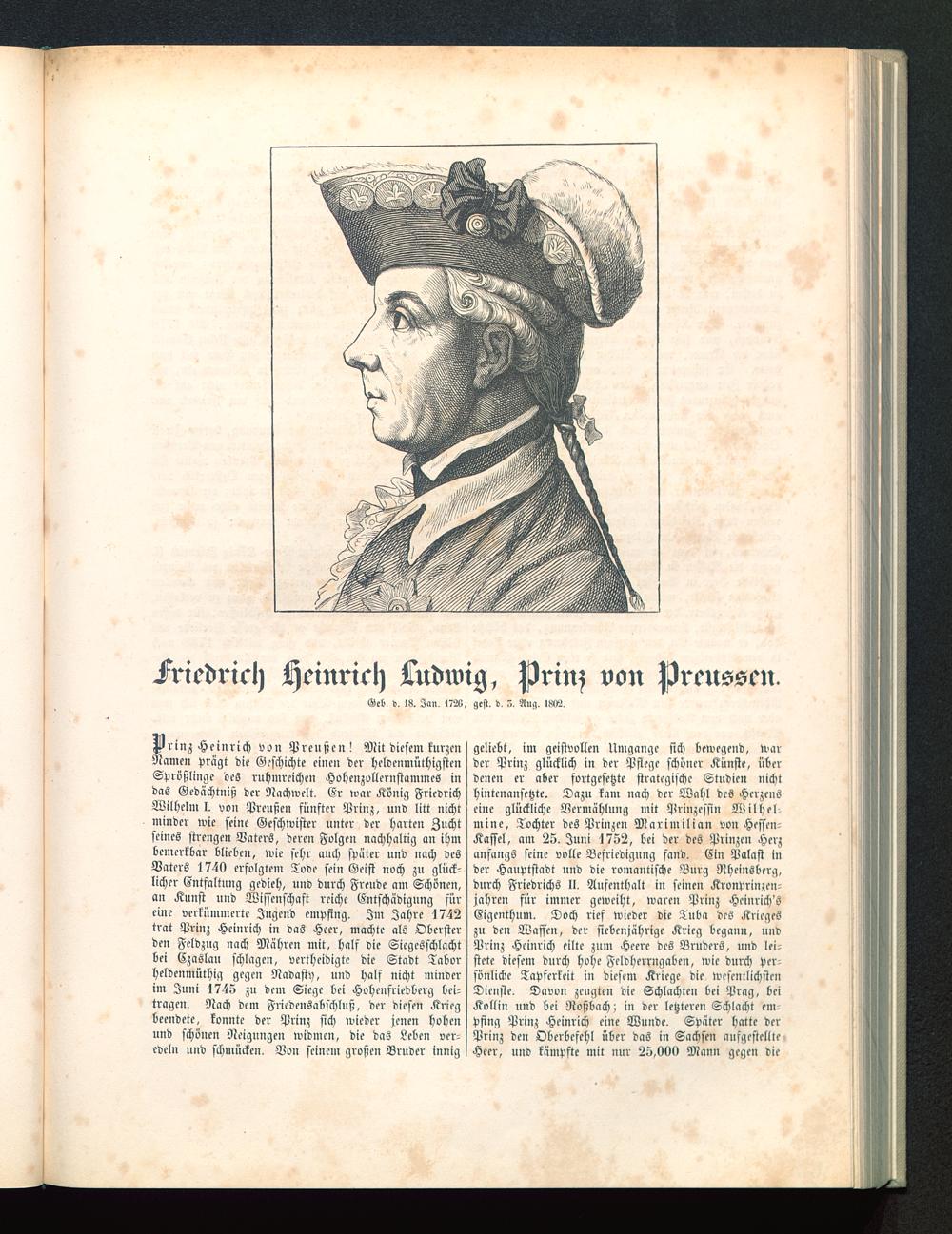 Prinz Heinrich von Preußen! Mit diesem kurzenNamen prägt die Geschichte einen der heldenmüthigstenSprößlinge des ruhmreichen Hohenzollernstammes indas Gedächtniß der Nachwelt. Er war König FriedrichWilhelm I. von Preußen fünfter Prinz, und litt nichtminder wie seine Geschwister unter der harten Zuchtseines strengen Vaters, deren Folgen nachhaltig an ihmbemerkbar blieben, wie sehr auch später und nach desVaters 1740 erfolgtem Tode sein Geist noch zu glück-licher Entfaltung gedieh, und durch Freude am Schönen,an Kunst und Wissenschaft reiche Entschädigung füreine verkümmerte Jugend empfing. Im Jahre 1742trat Prinz Heinrich in das Heer, machte als Obersterden Feldzug nach Mähren mit, half die Siegcsschlachtbei Czaslau schlagen, vertheidigte die Stadt Taborheldenmüthig gegen Nadasty, und half nicht minderim Juni 1748 zu dem Siege bei Hohenfriedberg bei-tragen. Nach dem Friedensabschluß, der diesen Kriegbeendete, konnte der Prinz sich wieder jenen hohenund schönen Neigungen widmen, die das Leben ver-edeln und schmücken. Von seinem großen Bruder innig