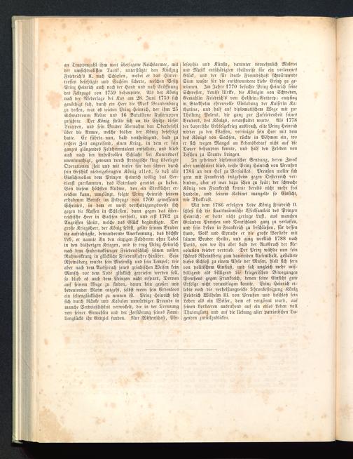 Mit dem 1786 erfolgten Tode König Friedrich II. schloß sich die staatsmäunische Wirksamkeit des PrinzenHeinrich; er hatte nicht geringe Lust, aus manchenGründen Preußen und Deutschland ganz zu verlassen,und sein Leben in Frankreich zu beschließen, für dessenLand, Volk und Sprache er die große Vorliebe mitseinem Bruder theilte, und ging wirklich 1788 nachParis , von wo ihn aber bald der Ausbruch der Re-volution wieder vertrieb. Der Prinz wählte nun seinschönes Rheinsberg zum dauernden Aufenthalt, gestaltetedieses Schloß zu einem Asyle der Musen, hielt sich fernvon politischem Einfluß, und sah ungleich mehr miß-billigend als billigend die kriegerischen BewegungenPreußens gegen Frankreich , denen seine Einsicht guteErfolge nicht voraussagen konnte. Prinz Heinrich er-lebte noch die vcrheißungreiche Thronbesteigung KönigFriedrich Wilhelm III. von Preußen und beschloß seinLeben als ein Weiser, dem es vergönnt ward, aufseinen Lorbeeren ausruhend auf ein edles Leben vollThatenglanz und auf die Uebung aller patriotischen Tu-genden zurückzublicken.