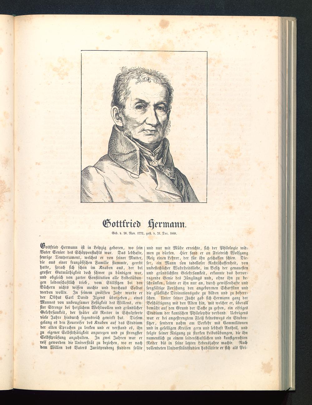 Gottfried Hermann ist in Leipzig geboren, wo seinVater Senior des Schöppenstuhls war. Das lebhafte,feurige Temperament, welches er von seiner Mutter,die aus einer französischen Familie stammte, geerbthatte, sprach sich schon im Knaben aus, der beigroßer Gutmüthigkeit doch schwer zu bändigen war,und obgleich von zarter Constitution alle Leibesübun-gen leidenschaftlich trieb, vom Stillsitzen bei denBüchern nichts wissen mochte und durchaus Soldatwerden wollte. In seinem zwölften Jahr wurde erder Obhut Carl David Jlgens übergeben, einesMannes von unbeugsamer Festigkeit des Willens, ern-ster Strenge bei herzlichem Wohlwollen und gründlicherGelehrsamkeit, der später als Rector in Schulpforteviele Jahre hindurch segensreich gewirkt hat. Diesemgelang es den Feuereifer des Knaben auf das Studiumder alten Sprachen zu lenken und er verstand es, ihnzu eigener Selbstthätigkeit anzuregen und zu strengsterSelbstprüfung anzuhalten. In zwei Jahren war erreif geworden die Universität zu beziehen, wo er nachdem Willen des Vaters Jurisprudenz studiren sollte