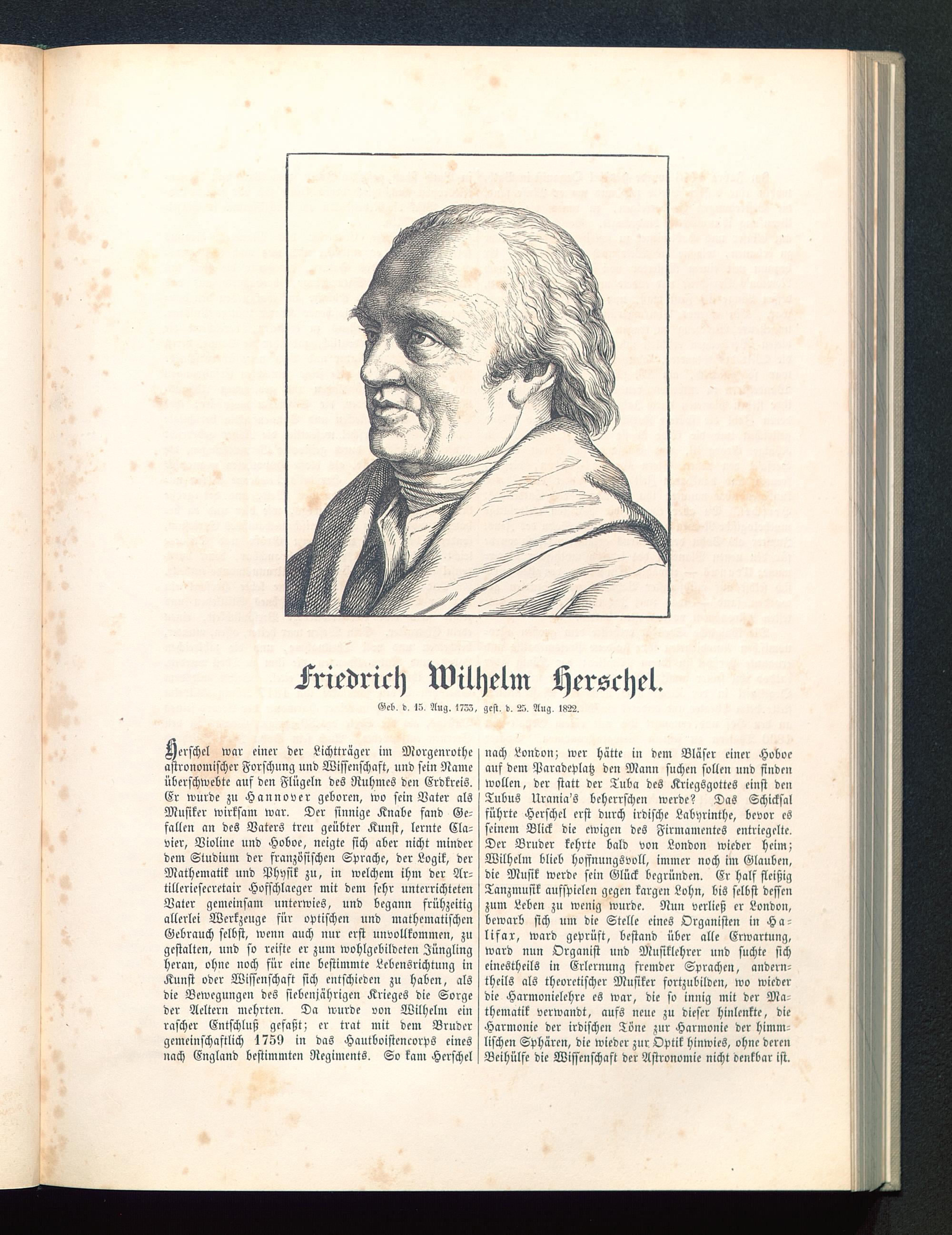 Herschel war einer der Lichtträger im Morgenrötheastronomischer Forschung und Wissenschaft, und sein Nameüberschwebte auf den Flügeln des Ruhmes den Erdkreis.Er wurde zu Hannover geboren, wo sein Vater alsMusiker wirksam war. Der sinnige Knabe fand Ge-fallen an des Vaters treu geübter Kunst, lernte Kla-vier, Violine und Hoboe, neigte sich aber nicht minderdem Studium der französischen Sprache, der Logik, derMathematik und Physik zu, in welchem ihm der Ar-tilleriesecretair Hofschlaeger mit dem sehr unterrichtetenVater gemeinsam unterwies, und begann frühzeitigallerlei Werkzeuge für optischen und mathematischenGebrauch selbst, wenn auch nur erst unvollkommen, zugestalten, und so reifte er zum wohlgebildcten Jünglingheran, ohne noch für eine bestimmte Lebensrichtung inKunst oder Wissenschaft sich entschieden zu haben, alsdie Bewegungen des siebenjährigen Krieges die Sorgeder Aeltern mehrten. Da wurde von Wilhelm einrascher Entschluß gefaßt; er trat mit dem Brudergemeinschaftlich 1759 in das Hautboistencorps einesnach England bestimmten Regiments. So kam Herschel