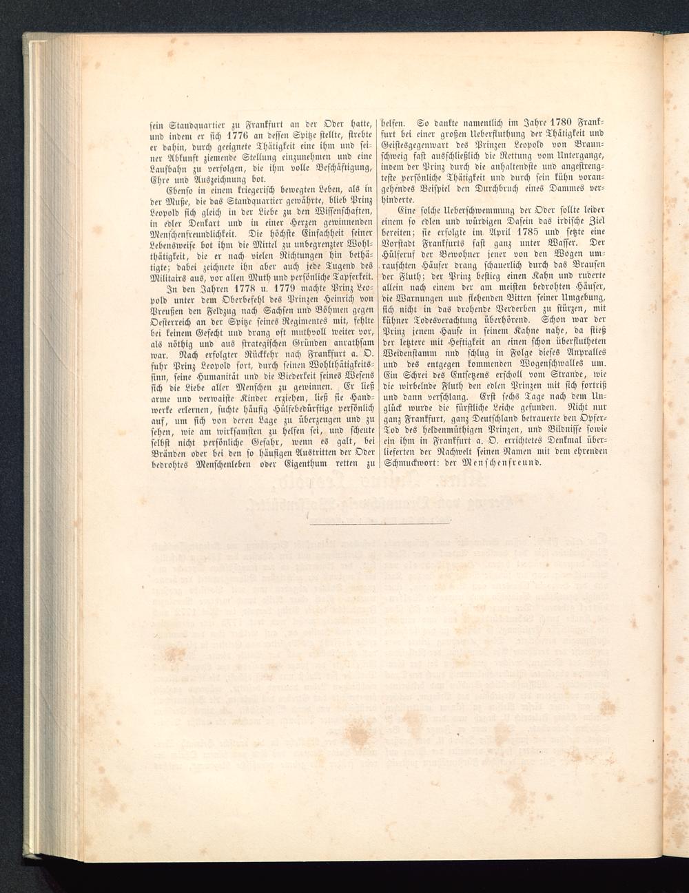 In den Jahren 1778 u. 1779 machte Prinz Leo-pold unter dem Oberbefehl des Prinzen Heinrich vonPreußen den Feldzug nach Sachsen und Böhmen gegenOesterreich an der Spitze seines Regimentes mit, fehltebei keinem Gefecht und drang oft muthvoll weiter vor,als nöthig und aus strategischen Gründen anrathsamwar. Nach erfolgter Rückkehr nach Frankfurt a. O.fuhr Prinz Leopold fort, durch seinen Wohlthätigkeits-sinn, seine Humanität und die Biederkeit seines Wesenssich die Liebe aller Menschen zu gewinnen. Er ließarme und verwaiste Kinder erziehen, ließ sie Hand-werke erlernen, suchte häufig Hülfebedürftige persönlichauf, um sich von deren Lage zu überzeugen und zusehen, wie am wirksamsten zu helfen sei, und scheuteselbst nicht persönliche Gefahr, wenn es galt, beiBränden oder bei den so häufigen Austritten der Oderbedrohtes Menschenleben oder Eigenthum retten zu