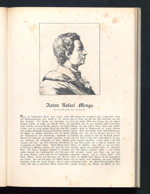 Einer der berühmtesten Maler unter denen, welcheeine Wiedervereinigung ihrer Kunst in der neuerenZeit bewirkten. Die Epoche der sogenannten alt-deutschen Schule, in welcher ein Albrecht Dürer , einHans Holbein , ein Lncas Cranach glänzten, war längstvorüber, und der durch unselige Kriege und durch Bei-spiele wälscher Geschmacksverirrung herbeigeführte Verfallder Künste im deutschen Vaterlande war im Bundemit Schnörkelwerk und Uebcrladung, namentlich inMalerei und Bildncrei, zur Unnatur geworden, so daßeine Läuterung des Geschmacks in diesen Künstendringend noth that. Zu dieser Läuterung half Mengs vorzugsweise die Bahn brechen. Rafael Mengs wurdezu Aussig in Böhmen geboren, und zwar auf einerReise. Der Vater, königlicher Hofmaler in Dresden ,wählte sinnreich und beziehnngsrcich zwei Vornamenfür seinen Knaben, welche einst zwei der berühmtestenMaler führten: Anton von Correggio und Rafaelvon Urbino, und gab ihm später eine äußerst strengeErziehung, welche nur darauf hinzielte, daß der junge.Rafael einst auch ein bedeutender Maler werden sollte.