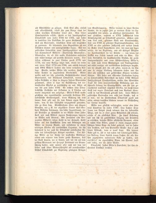als Schriftsteller zu glänzen. Sein Styl aber, einfachund allverständlich, erhob ihn zum Range eines derersten deutschen Prosaisten seiner Zeit. Von reinerVaterlandsliebe erfüllt, schrieb er das JntelligenzblattOsnabrücks vom Jahre 1766 bis 1782, und suchtein demselben sein Publikum für guten Geschmack, An-theil am Vaterlands, häuslichen Sinn und dergleichenzu gewinnen. Er behandelte seine Gegenstände oft mitköstlichem Humor und unvergleichlicher Laune. Aus denzahlreichen Leitartikeln jener Jntelligcnzblätter entstanddas Sammelwerk Möser's : «Patriotische Phantasien»,Phantasten, die oft sehr nackte Wahrheiten enthieltenund nichts weniger als poetische Fictionen waren. Die-selben erschienen in zwei Theilen zuerst 1775 und1776, eine neue Auflage folgte bald, ebenso der dritteund vierte Theil 1776 und 1786, und endlich besorgtenoch 1861 Möser's Tochter eine dritte vermehrte Auf-lage. Goethe, welcher Möser sehr verehrte, stand mitdieser Tochter in anziehendem Briefwechsel. Möser wollte auch der sehr gründliche Geschichtschreiber seinesVaterlandes, des Bisthums Osnabrück, werden, zudessen Geschichte er schon in jüngcrn Jahren Materialiengesammelt, allein er legte die Ausführung des ver-dienstvollen Werkes zu weitschichtig an und führte esnur bis zum Jahre 1192. Es erschien seine Osna-brückische Geschichte mit Urkunden in 2 Theilen undwurde cinigemale neu aufgelegt. Möser's Geist wecktegleichsam eine eigenthümliche patriotisch strebsame Os-nabrückische Gelehrtenzunft, deren Richtung sich nochimmer kund gibt und die dem kleinen engen Vater-lande, dem sie ihre Thätigkeit vorzugsweise zuwandte,sehr zu Gute kam. Glcichstrebende ältere und jüngereGenossen, wie z. B. der angeführte Doctor Carl Ger-hard Wilhelm Lodtmann , sein bester Jugendfreund, derals Professor zu Hclmstädt in der Blüthe seiner Jahrestarb und nach Möscrs eigenen Aeußerungen letzterenan Wissen noch übertraf, Abt Jerusalem (ein Ver-wandter Möser's) lebten theils in der Heimath, theilsspäter auf den Hochschulen Jena und Göttingcn mitMöser im trauten Bunde, und entfalteten in einemwürdigen Wirken alle patriotischen Tugenden, die sichbesonders in der auch für Osnabrück unheilvollen Pe-riode des siebenjährigen Krieges erprobten. Der thä-tige Möser an der Spitze der wackersten Mitbürgerrettete und ersparte dem Lande große Summen, halfder Noth steuern, wo er konnte, und sah sich mit demgrößten Vertrauen des Herzogs Ferdinand von Braun -schwcig beehrt, nicht minder aber auch mit dem desspäter nach seiner Minderjährigkeit als protestantischerBischof Osnabrücks zur Regierung gelangten Prinzen