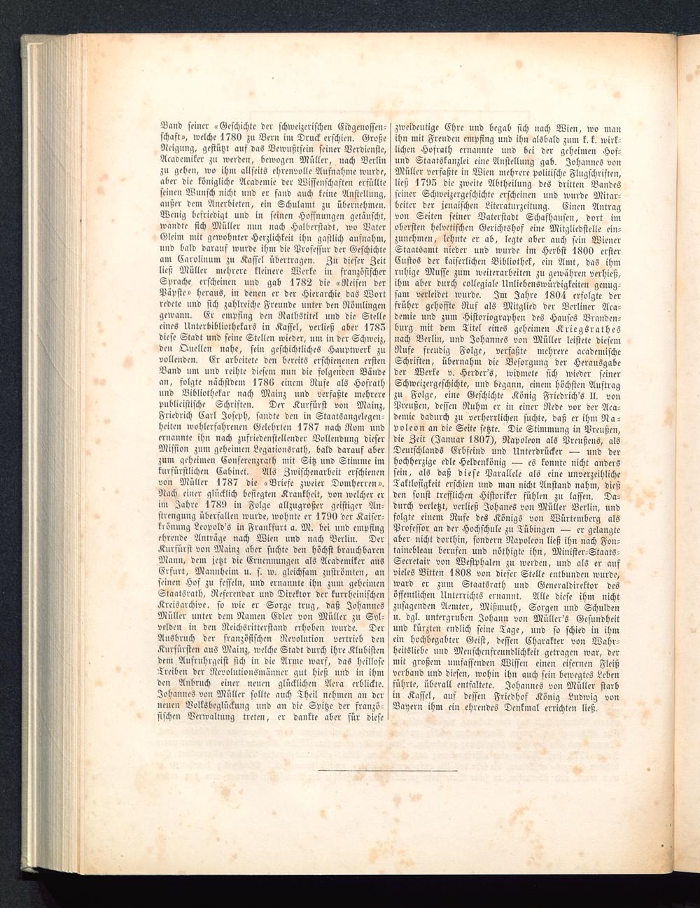 zweideutige Ehre und begab sich nach Wien , wo manihn mit Freuden empfing und ihn alsbald zum k. k. wirk-lichen Hosrath ernannte und bei der geheimen Hof-und Staatskanzlei eine Anstellung gab. Johannes vonMüller verfaßte in Wien mehrere politische Flugschriften,ließ 1705 die zweite Abtheilung des dritten Bandesseiner Schweizergeschichte erscheinen und wurde Mitar-beiter der Maischen Literaturzcitung. Einen Antragvon Seiten seiner Vaterstadt Schafhausen, dort imobersten helvetischen Gerichtshof eine Mitgliedstelle ein-zunehmen, lehnte er ab, legte aber auch sein Wiener StaatSamt nieder und wurde im Herbst 1800 ersterCustos der kaiserlichen Bibliothek, ein Amt, das ihmruhige Müsse zum weiterarbeiten zu gewähren verhieß,ihm aber durch collegiale Unliebenswürdigkeiten genug-sam verleidet wurde. Im Jahre 1804 erfolgte derfrüher gehoffte Ruf als Mitglied der Berliner Aka-demie und zum Historiographcn des Hauses Branden-burg mit dem Titel eines geheimen KriegsrathcSnach Berlin, und Johannes von Müller leistete diesemRufe freudig Folge, verfaßte mehrere academischcSchriften, übernahm die Besorgung der Herausgabeder Werke v. Herdcr's, widmete sich wieder seinerSchwcizergeschichte, und begann, einem höchsten Auftragzu Folge, eine Geschichte König Friedrichs II. vonPreußen, dessen Ruhm er in einer Rede vor der Aka-demie dadurch zu verherrlichen suchte, daß er ihm Na-poleon an die Seite setzte. Die Stimmung in Preußen ,die Zeit (Januar 1807), Napoleon als Preußens , alsDeutschlands Erbfeind und Unterdrücker — und derhochherzige edle Heldcnkönig — es konnte nicht anderssein, als daß diese Parallele als eine unverzeihlicheTaktlosigkeit erschien und man nicht Anstand nahm, dießden sonst trefflichen Historiker fühlen zu lassen. Da-durch verletzt, verließ Johanes von Müller Berlin , undfolgte einem Rufe des Königs von Würtembcrg alsProfessor an der Hochschule zu Tübingen — er gelangteaber nicht dorthin, sondern Napoleon ließ ihn nach Fon-taincbleau berufen und nöthigte ihn, Minister-Staats-Seeretair von Westphalen zu werden, und als er aufvieles Bitten 1808 von dieser Stelle entbunden wurde,ward er zum Staatsrath und Generaldirektor desöffentlichen Unterrichts ernannt. Alle diese ihm nichtzusagenden Aemter, Mißmuth, Sorgen und Schuldenu. dgl. untergruben Johann von Müller's Gesundheitund kürzten endlich seine Tage, und so schied in ihmein hochbegabter Geist, dessen Charakter von Wahr-heitsliebe unv Menschenfreundlichkeit getragen war, dermit großem umfassenden Wissen einen eisernen Fleißverband und diesen, wohin ihn auch sein bewegtes Lebenführte, überall entfaltete. Johannes von Müller starbin Kassel, auf dessen Friedhof König Ludwig vonBayern ihm ein ehrendes Denkmal errichten ließ.