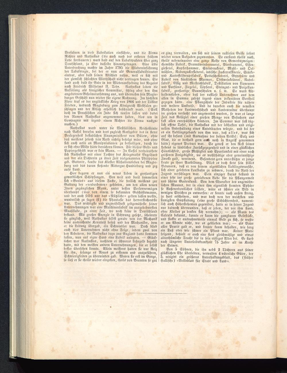es ging verwalten, um sich mit seinem rastlosen Geiste sofortwieder neuen Aufgaben zuzuwenden. So entstand theils nach,theils nebeneinander eine ganze Reihe von Gewerbszweigen:chemische Fabrik, Branntweinbrennerei, Bierbrauerei, Eisen-gießerei, Kupferhammer, Steiudruckerei, Mahl- und Oel-mühlen, Rübenzuckersiederei, indische Zuckerraffinerie, Stärke-und Kartoffelsyrupsfabrik, Pottaschesiederei, Gppshütte undFabrik von künstlichem Marmor, Obstwcinkelterei, Nudel-fabrik, Essig und Mostrichfabrik, Destillation von Liqueurenund Parfüms, Ziegelei, Töpferei, Steingut- und Porzellan-fabrik, großartige Baumschulen u. s. w. So ward Alt-haldensteben, ohne daß der rastlose Unternehmer aus demallen in Summa zuletzt irgend einen pekuniären Vortheilgezogen hätte, eine Pflanzschule der Industrie für nähereund weitere Umkreise. Und da daneben auch die neuestenMethoden der Landwirthschaft und Landescultur überhauptim großen versucht und angewendet wurden, so war es langeZeit das Reiseziel einer großen Menge von Besuchern ausfast allen europäischen Ländern. Im Sommer war fast täg-lich offene Tafel, die Nathusius mit der lebhaften und origi-nellen Unterhaltung eines Autodidakten würzte, und bei deres ein Lieblingsgedanke von ihm war, daß alles, was sichaus ihr befand (mit Ausnahme der beiden Artikel: Salz undGlas, die er deshalb gern auch noch in Angriff genommenhätte) eigenes Produkt war. So genoß er den Rest seinesLebens in ländlicher Zurückgezogenheit und in einer glücklichenHäuslichkeit, große Mäßigkeit und Sparsamkeit mit einer nochgrößeren Freigebigkeit, wo es wohlthätige oder gemeinnützigeZwecke galt, vereinend. Besonders gern unterstützte er jungeLeute zu ihrer Ausbildung. Blieb es doch stets sein stillesBedauern, daß er von seinem eigentlichen Lieblingswunsche,sich einer gelehrten Laufbahn zu widmen, durch die Noth derJugend verschlagen war. Sein einziger Lurus bestand ineiner sehr ins große getriebenen Liebe für die Pflanzenweltund schöne Gartenkunst. Von dem Charakter des ungewöhn-lichen Mannes, der in einer ihm eigentlich fremden Sphäreso Außerordentliches leistete, wäre es schwer ein Bild inwenigen Strichen zu entwerfen: er konnte nach außen streng,ja hart erscheinen, und war doch von der weichsten undsinnigsten Empfindung (eine große Schüchternheit, nament-lich auch Höherstehenden gegenüber, hatte er in seiner Jugendnur dadurch überwunden, daß er jeden, der vor ihm stand,ohne Kleider zu denken sich vornahm); — als Mann desCalculs bekannt, kannte er kaum die gangbaren Geldstücke,und steckte er ausnahmsweise einmal Geld zu sich, so wußteer am Abende nicht, wo es geblieben war; — als Vateraller Praris galt er, und konnte kaum behalten, wie langein Fuß oder wie schwer ein Pfund war. Keiner Modefolgend, behielt er auch eine stets gleichmäßige und etwasalterthümliche Tracht bis in sein rüstiges Alter bei. Er starbnach längerer Nnterleibskrankheit 75 Jahre alt im Kreiseder Seinen.