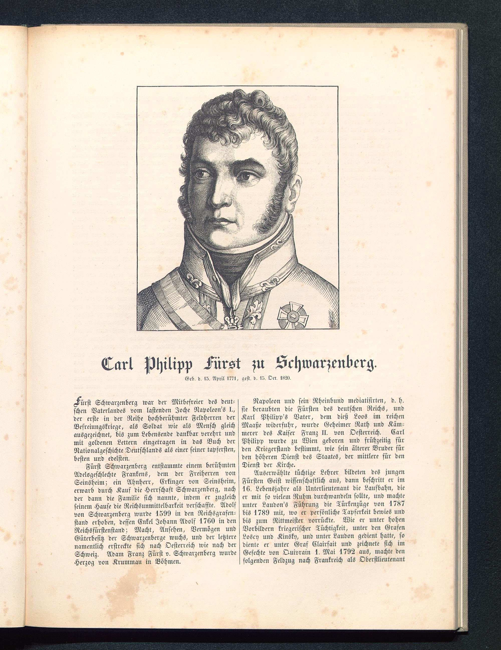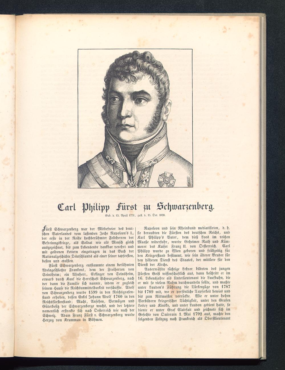 gierst Schwarzcnberg war der Mitbefreier des deut-schen Vaterlandes vom lastenden Joche Napoleon's I. ,der erste in der Reihe hochberühmter Feldherren derBefreiungskriege, als Soldat wie als Mensch gleichausgezeichnet, bis zum Lebensende dankbar verehrt undmit goldenen Lettern eingetragen in das Buch derNationalgcschichte Deutschlands als einer seiner tapfersten,besten und edelsten.