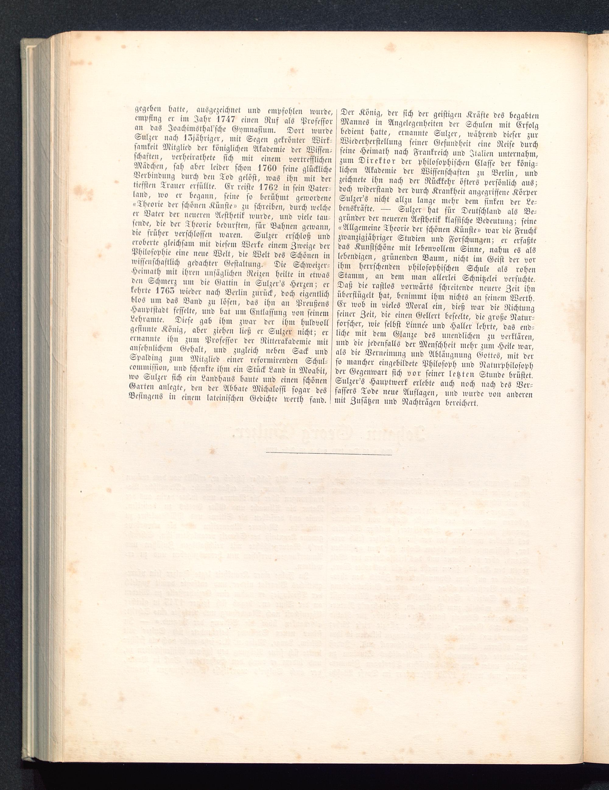 Der König, der sich der geistigen Kräfte des begabtenMannes in Angelegenheiten der Schulen mit Erfolgbedient hatte, ernannte Sulzer , während dieser zurWiederherstellung seiner Gesundheit eine Reise durchseine Heimath nach Frankreich und Italien unternahm,zum Direktor der philosophischen Classe der könig-lichen Akademie der Wissenschaften zu Berlin, undzeichnete ihn nach der Rückkehr öfters persönlich aus;doch widerstand der durch Krankheit angegriffene KörperSulzer's nicht allzu lange mehr dem sinken der Le-benskräfte. — Sulzcr hat für Deutschland als Be-gründer der neueren Aesthetik klassische Bedeutung; seine«Allgemeine Theorie der schönen Künste» war die Fruchtzwanzigjähriger Studien und Forschungen; er erfaßtedas Kunstschöne mit lebenvollem Sinne, nahm es alslebendigen, grünenden Baum, nicht im Geist der vorihm herrschenden philosophischen Schule als rohenStamm, an dem man allerlei Schnitzelei versuchte.Daß die rastlos vorwärts schreitende neuere Zeit ihnüberflügelt hat, benimmt ihm nichts an seinem Werth.Er wob in vieles Moral ein, dieß war die Richtungseiner Zeit, die einen Geliert beseelte, die große Natur-forscher, wie selbst Linnc'e und Halter lehrte, das end-liche mit dem Glänze des unendlichen zu verklären,und die jedenfalls der Menschheit mehr znm Heile war,als die Verneinung und Ablängnung Gottes, mit derso mancher eingebildete Philosoph und Naturphilosophder Gegenwart sich vor seiner letzten Stunde brüstet.Sulzer's Hauptwerk erlebte auch »och nach des Ver-fassers Tode neue Auflage», und wurde von anderenmit Zusätzen und Nachträge» bereichert.
