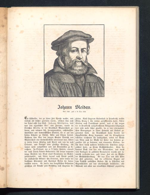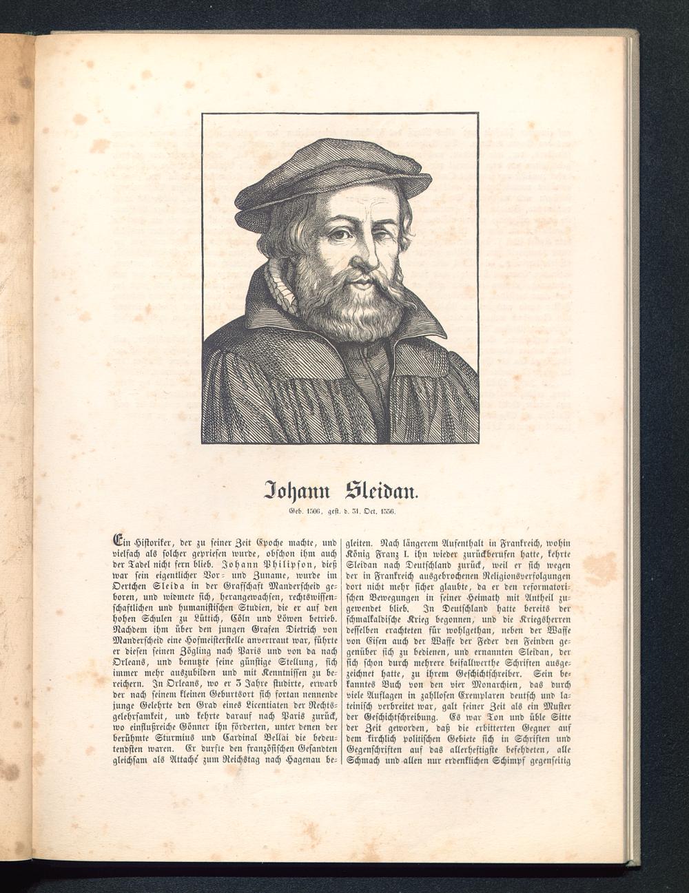 Ein Historiker, der zu seiner Zeit Epoche machte, undvielfach als solcher gepriesen wurde, obschon ihm auchder Tadel nicht fern blieb. Johann Philipson, dießwar sein eigentlicher Vor- und Zuname, wurde imOertchen Sleida in der Grafschaft Manderscheid ge-boren, und widmete sich, herangewachsen, rcchtswissen-schaftlichen und humanistischen Studien, die er auf denhohen Schulen zu Lüttich , Cöln und Löwen betrieb.Nachdem ihm über den jungen Grafen Dietrich vonManderscheid eine Hofmeistcrstelle anvertraut war, führteer diesen seinen Zögling nach Paris und von da nachOrlcans, und benutzte seine günstige Stellung, sichimmer mehr auszubilden und mit Kenntnissen zu be-reichern. In Orleans , wo er 3 Jahre studirte, erwarbder nach seinem kleinen Geburtsort sich fortan nennendejunge Gelehrte den Grad eines Liccntiaten der Ncchts-gelehrsamkeit, und kehrte darauf nach Paris zurück,wo einflußreiche Gönner ihn förderten, unter denen derberühmte Sturmius und Cardinal Bellai die bedeu-tendsten waren. Er durfte den französischen Gesandtengleichsam als Attache zum Reichstag nach Hagenau be-