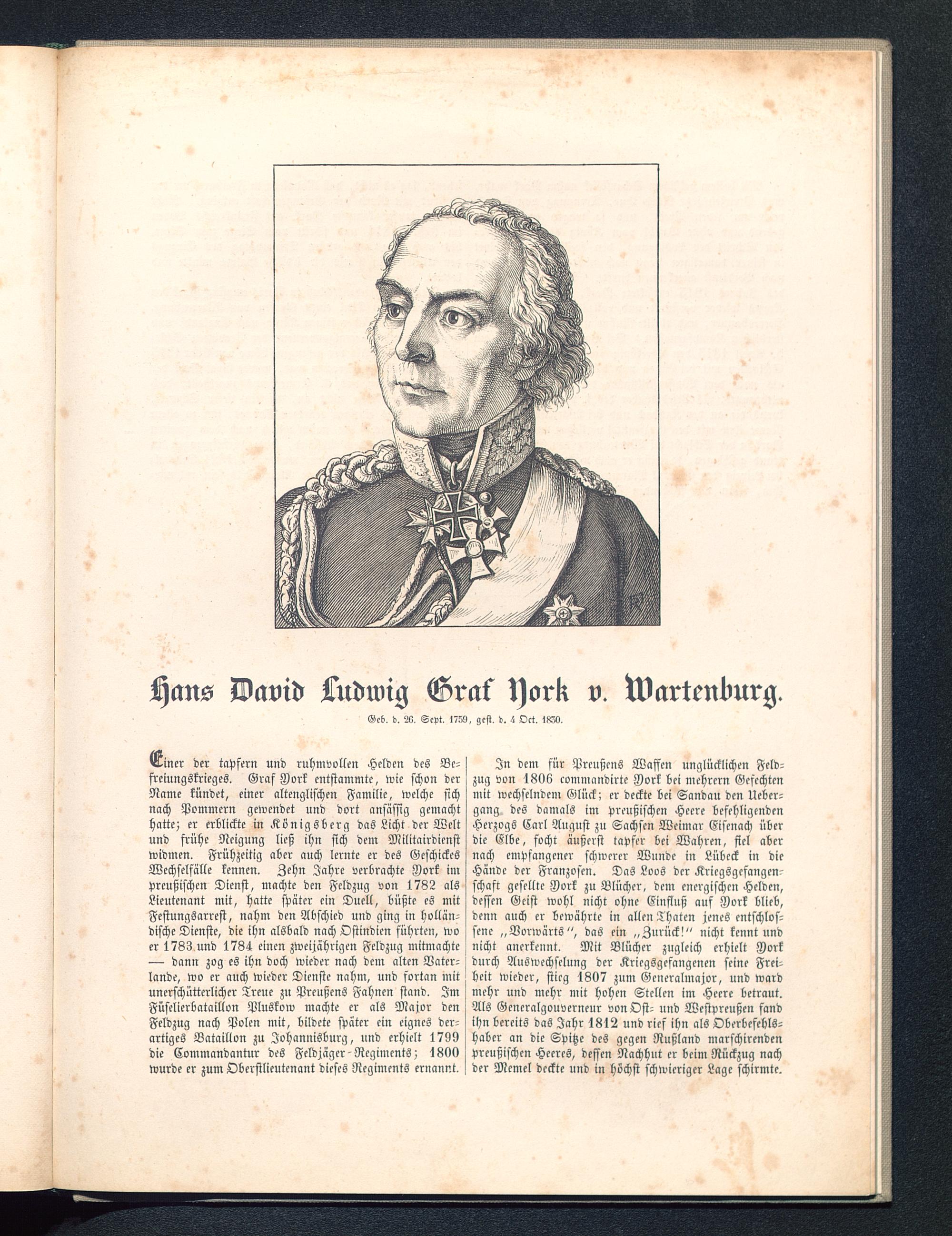 xHiner der tapfern und ruhmvollen Helden des Be-freiungskrieges. Graf Dort entstammte, wie schon derName kündet, einer altenglischen Familie, welche sichnach Pommern gewendet und dort ansässig gemachthatte; er erblickte in Königsberg das Licht der Weltund frühe Neigung ließ ihn sich dem Militärdienstwidmen. Frühzeitig aber auch lernte er des GeschickesWcchselfälle kennen. Zehn Jahre verbrachte Dork impreußischen Dienst, machte den Feldzug von 1782 alsLieutenant mit, hatte später ein Duell, büßte es mitFestungsarrest, nahm den Abschied und ging in hollän-dische Dienste, die ihn alsbald nach Ostindien führten, woer 1783.und 1784 einen zweijährigen Feldzug mitmachte— dann zog es ihn doch wieder nach dem alten Vater-lande, wo er auch wieder Dienste nahm, und fortan mitunerschütterlicher Treue zu Preußens Fahnen stand. ImFüselierbataillon Pluskow machte er als Major denFeldzug nach Polen mit, bildete später ein eignes der-artiges Bataillon zu Johannisburg, und erhielt 1799die Kommandantur des Feldjäger Regiments; 1800wurde er zum Oberstlieutenant dieses Regiments ernannt.