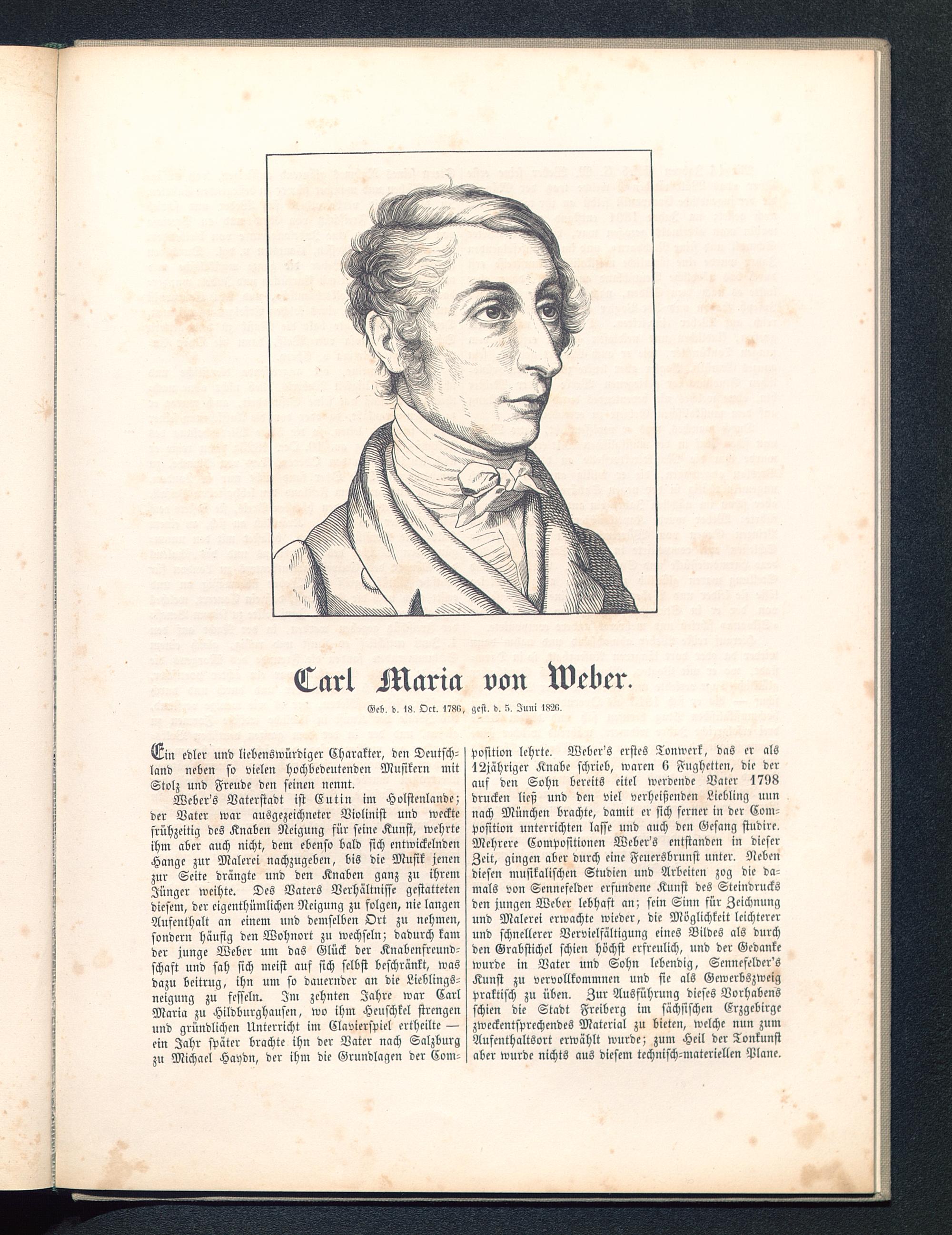 Wcber's Vaterstadt ist Eutin im Holstenlande;der Vater war ausgezeichneter Violinist und wecktefrühzeitig des Knaben Neigung für seine Kunst, wehrteihm aber auch nicht, dem ebenso bald sich entwickelndenHange zur Malerei nachzugeben, bis die Musik jenenzur Seite drängte und den Knaben ganz zu ihremJünger weihte. Des Vaters Verhältnisse gestattetendiesem, der eigenthümlichen Neigung zu folgen, nie langenAufenthalt an einem und demselben Ort zu nehmen,sondern häufig den Wohnort zu wechseln; dadurch kamder junge Weber um das Glück der Knabcnfrcund-schast und sah sich meist auf sich selbst beschränkt, wasdazu beitrug, ihn um so dauernder an die Lieblings-neigung zu fesseln. Im zehnten Jahre war CarlMaria zu Hildburghausen, wo ihm Heuschkcl strengenund gründlichen Unterricht im Clavierspiel ertheilte —ein Jahr später brachte ihn der Vater nach Salzburg zu Michael Haydn, der ihm die Grundlagen der Kom-
