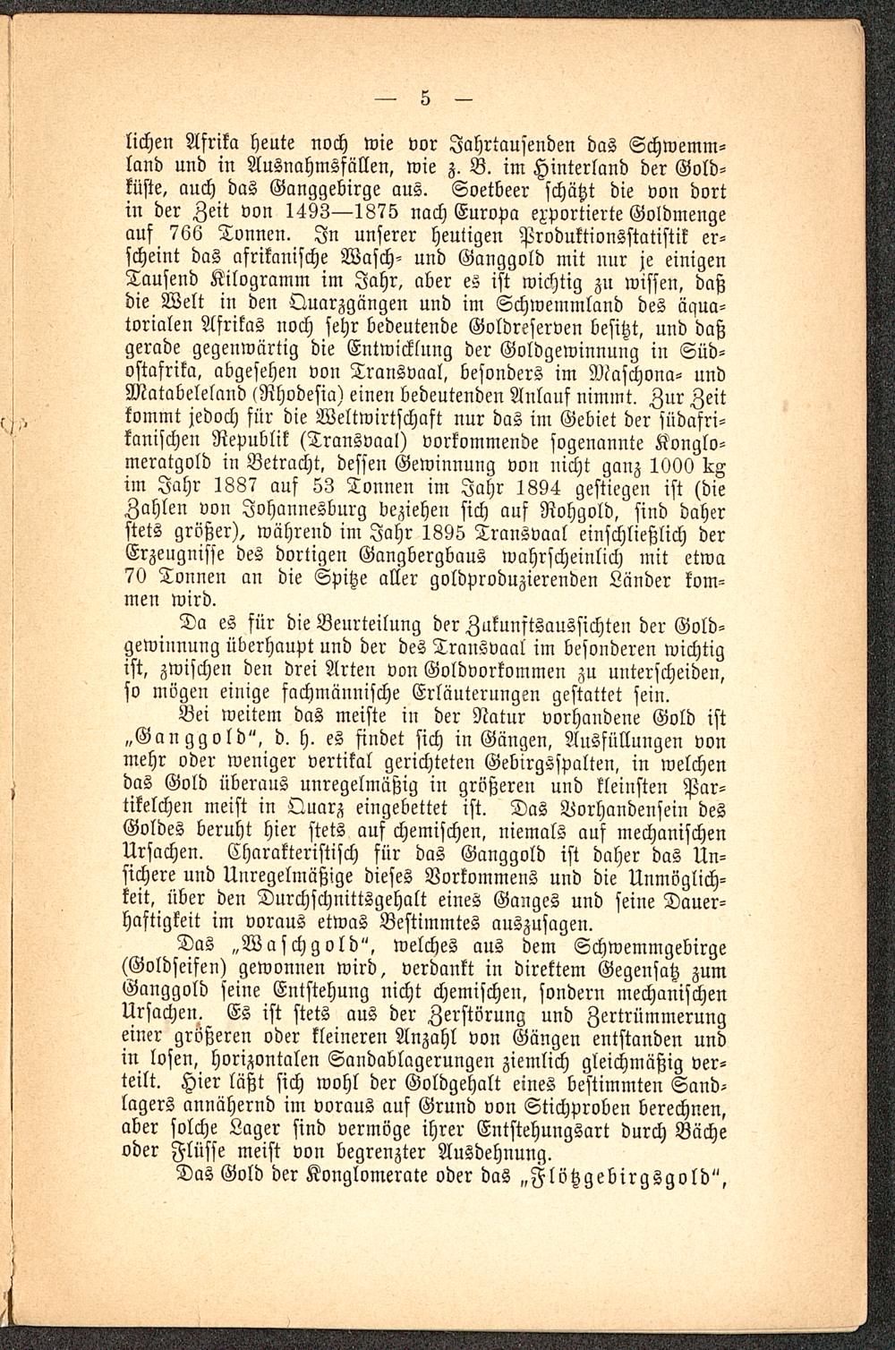 lichen Afrika heute noch wie vor Jahrtausenden das Schwemm-land und in Ausnahmsfällen, wie z. B. im Hinterland der Gold-küste, auch das Ganggebirge aus. Soetbeer schätzt die von dortin der Zeit von 1493—1875 nach Europa exportierte Goldmengeauf 766 Tonnen. In unserer heutigen Produktionsstatistik er-scheint das afrikanische Wasch- und Ganggold mit nur je einigenTausend Kilogramm im Jahr, aber es ist wichtig zu wissen, daßdie Welt in den Quarzgängen und im Schwemmland des äqua-torialen Afrikas noch sehr bedeutende Goldreserven besitzt, und daßgerade gegenwärtig die Entwicklung der Goldgewinnung in Süd-ostafrika, abgesehen von Transvaal, besonders im Maschona- undMatabeleland lRhodesia) einen bedeutenden Anlanf nimmt. Zur Zeitkommt jedoch für die Weltwirtschaft nur das im Gebiet der südafri-kanischen Republik (Transvaal ) vorkommende sogenannte Konglo-meratgold in Betracht, dessen Gewinnung von nicht ganz 1000 KZim Jahr 1887 auf 53 Tonnen im Jahr 1894 gestiegen ist (dieZahlen von Johannesburg beziehen sich auf Rohgold, sind daherstets größer), während im Jahr 1895 Transvaal einschließlich derErzeugnisse des dortigen Gangbergbaus wahrscheinlich mit etwa70 Tonnen an die Spitze aller goldproduzierenden Länder kom-men wird.