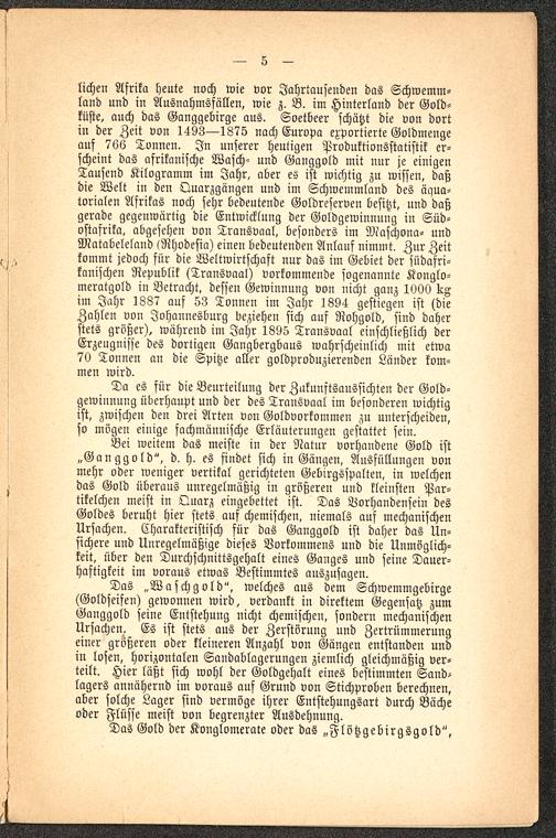 Da es für die Beurteilung der Zukunftsaussichten der Gold-gewinnung überhaupt und der des Transvaal im besonderen wichtigist, zwischen den drei Arten von Goldvorkommen zu unterscheiden,so mögen einige fachmännische Erläuterungen gestattet sein.