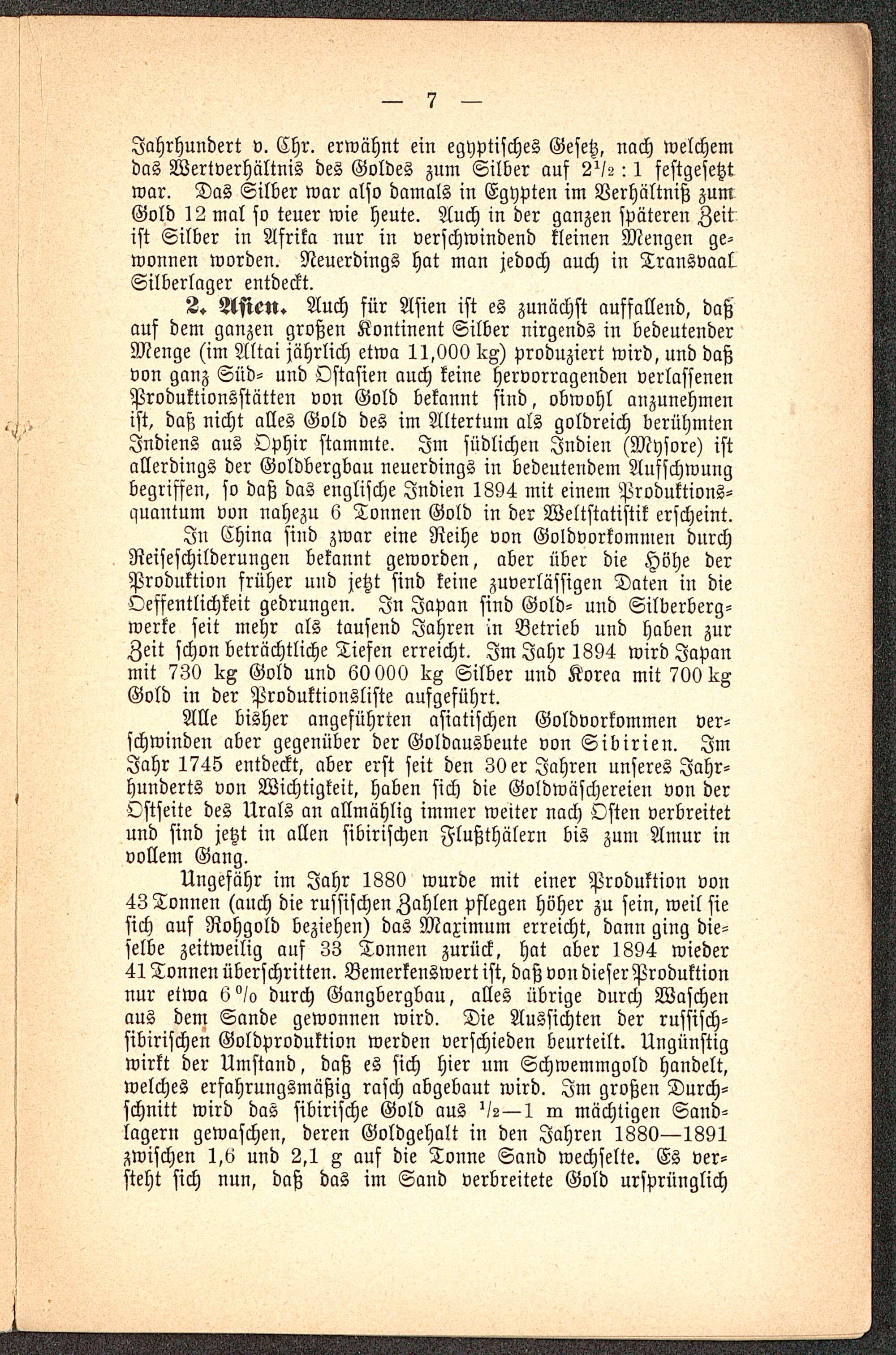 Jahrhundert v. Chr. erwähnt ein egyptisches Gesetz, nach welchemdas Wertverhältnis des Goldes zum Silber auf 2^/2:1 festgesetztwar. Das Silber war also damals in Egypten im Verhältniß zumGold 12 mal so teuer wie heute. Auch in der ganzen späteren Zeitist Silber in Afrika nur in verschwindend kleinen Mengen ge-wonnen worden. Neuerdings hat man jedoch auch in Transvaal.Silberlager entdeckt.