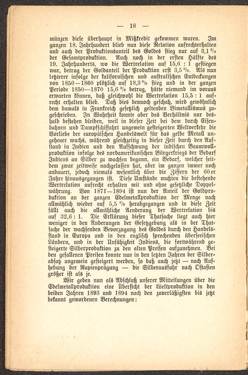 münzen diese überhaupt in Mißkredit gekommen waren. Imganzen 18. Jahrhundert blieb nun diese Relation aufrechterhaltenund auch der Produktionsanteil des Goldes stieg nur auf 3,1 °/oder Gesamtproduktion. Auch noch in der ersten Hälfte des19. Jahrhunderts, wo die Wertrelation auf 15,6 : 1 gestiegenwar, betrug der Goldanteil der Produktion erst 3,5 °/o. Als nunletzterer infolge der kalifornischen und australischen Entdeckungenvon 1850 — 1860 plötzlich auf 18,3 °/o stieg und in der ganzenPeriode 1850—1870 15,6 °/o betrug, hätte niemand im vorauserwarten können, daß gleichwohl die Wertrelation 15,5 : 1 auf-recht erhalten blieb. Daß dies dennoch geschah, wird gewöhnlichdem damals in Frankreich gesetzlich geltenden Bimetallismus zu-geschrieben. In Wahrheit konnte aber das Verhältnis nur des-halb bestehen bleiben, weil in dieser Zeit bei dem durch Eisen-bahnen und Dampfschiffahrt ungemein gesteigerten Weltverkehr dieVorliebe der europäischen Handelswelt für das gelbe Metall un-geheuer wuchs, während gleichzeitig in dieser Zeit durch den Auf-stand in Indien und den Aufschwung der indischen Baumwoll-produktion infolge des nordamerikanischen Bürgerkriegs der BedarfIndiens an Silber zu wachsen begann, ein Bedarf, welcher seit-dem zwar zeitweise nachgelassen hat, aber im ganzen immer nochandauert, jedoch niemals wesentlich über die Ziffern der 60 erJahre hinausgegangen ist. Diese Umstände mußten die bestehendeWertrelation aufrecht erhalten mit und ohne gesetzliche Doppel-währung. Von 1871—1894 ist nun der Anteil der Goldpro-duktion an der ganzen Edelmetallproduktion der Menge nachallmählich wieder auf 5,5 °/o herabgegangen und in diese Zeitfällt auch die allmähliche Aenderung der Wertrelation bisauf 32,6 : 1. Die Erklärung dieser Thatsache liegt auch hierweniger in den Änderungen der Gesetzgebung als in der That-sache der wachsenden Bevorzugung des Goldes durch den Handels-stand in Europa und in den englisch sprechenden überseeischenLändern, und in der Unfähigkeit Indiens, die fortwährend ge-steigerte Silberproduktion zu den alten Preisen aufzunehmen. Beiden gefallenen Preisen konnte nun in den letzten Jahren der Silber-absatz ungemein gesteigert werden, so daß auch jetzt — nach Auf-hebung der Rupieuprägung — die Silberausfuhr nach Ostasien größer ist als je.