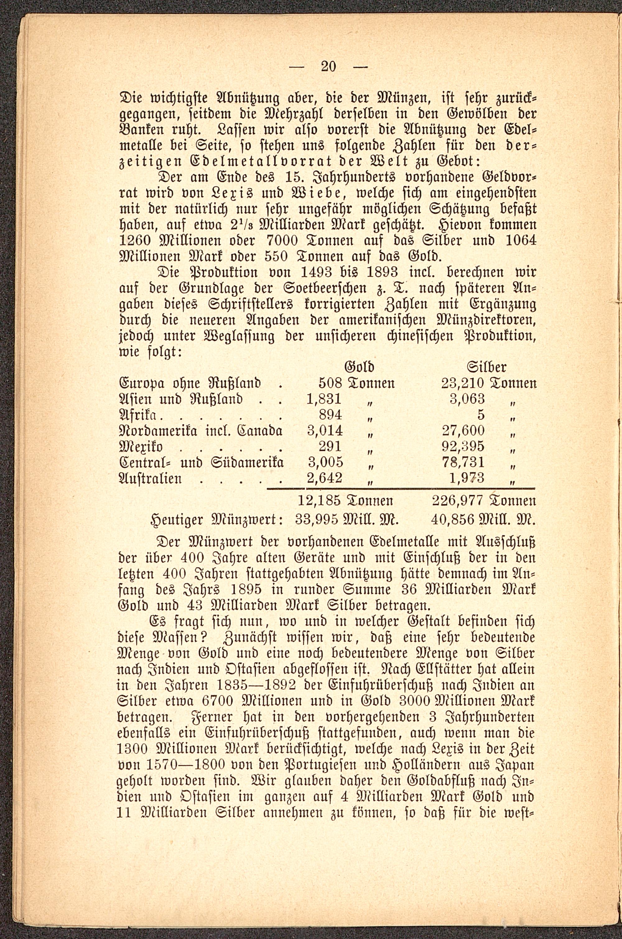 Der Münzwert der vorhandenen Edelmetalle mit Ausschlußder über 400 Jahre alten Geräte und mit Einschluß der in denletzten 400 Jahren stattgehabten Abnützung hätte demnach im An-fang des Jahrs 1895 in runder Summe 36 Milliarden MarkGold und 43 Milliarden Mark Silber betragen.