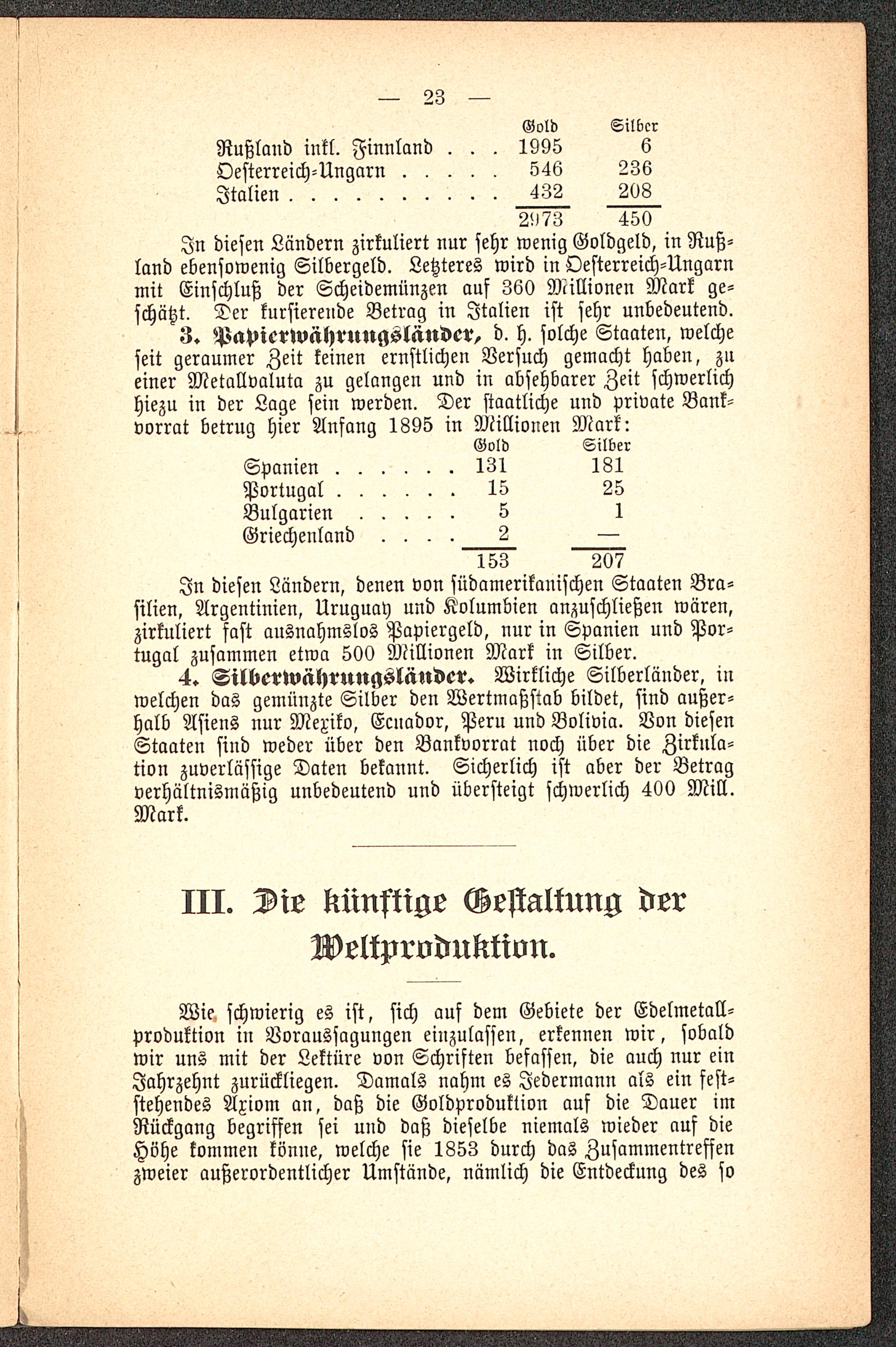 153 207In diesen Ländern, denen von südamerikanischen Staaten Bra-silien , Argentinien, Uruguay und Kolumbien anzuschließen wären,zirkuliert fast ausnahmslos Papiergeld, nur in Spanien und Por-tugal zusammen etwa 500 Millionen Mark in Silber.