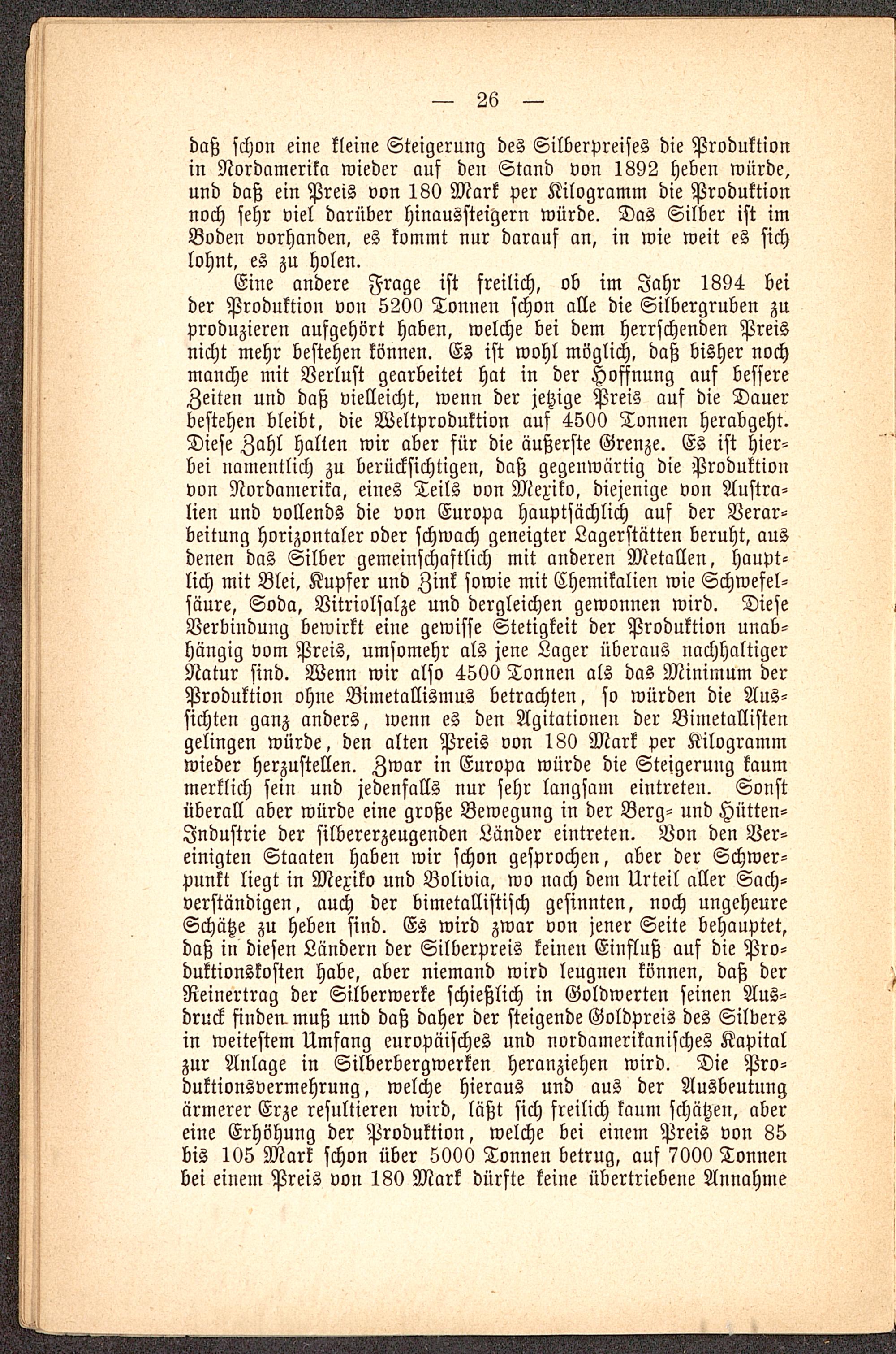 daß schon eine kleine Steigerung des Silberpreises die Produktionin Nordamerika wieder auf den Stand von 1892 heben würde,und daß ein Preis von 180 Mark per Kilogramm die Produktionnoch sehr viel darüber hinaussteigern würde. Das Silber ist imBoden vorhanden, es kommt nur darauf an, in wie weit es sichlohnt, es zu holen.