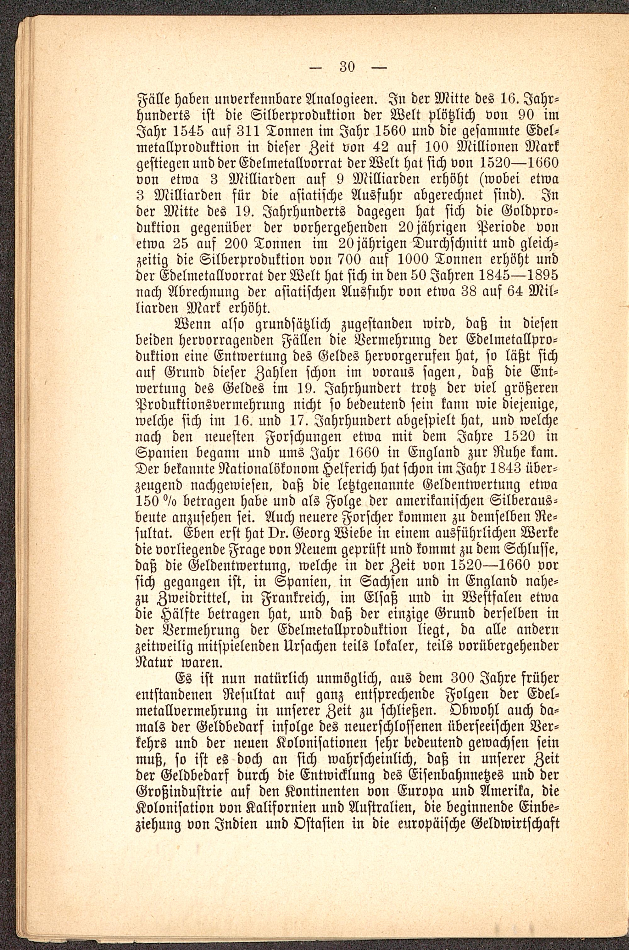 Fälle haben unverkennbare Analogieen. In der Mitte des 16. Jahr-hunderts ist die Silberproduktion der Welt plötzlich von 90 imJahr 1545 auf 311 Tonnen im Jahr 1560 und die gesammte Edel-metallproduktion in dieser Zeit von 42 auf 100 Millionen Markgestiegen und der Edelmetallvorrat der Welt hat sich von 15201060von etwa 3 Milliarden auf 9 Milliarden erhöht (wobei etwa3 Milliarden für die asiatische Ausfuhr abgerechnet sind). Inder Mitte des 19. Jahrhunderts dagegen hat sich die Goldpro-duktion gegenüber der vorhergehenden 20 jährigen Periode vonetwa 25 auf 200 Tonnen im 20 jährigen Durchschnitt und gleich-zeitig die Silberproduktion von 700 auf 1000 Tonnen erhöht undder Edelmetallvorrat der Welt hat sich in den 50 Jahren 18451895nach Abrechnung der asiatischen Ausfuhr von etwa 38 auf 64 Mil-liarden Mark erhöht.