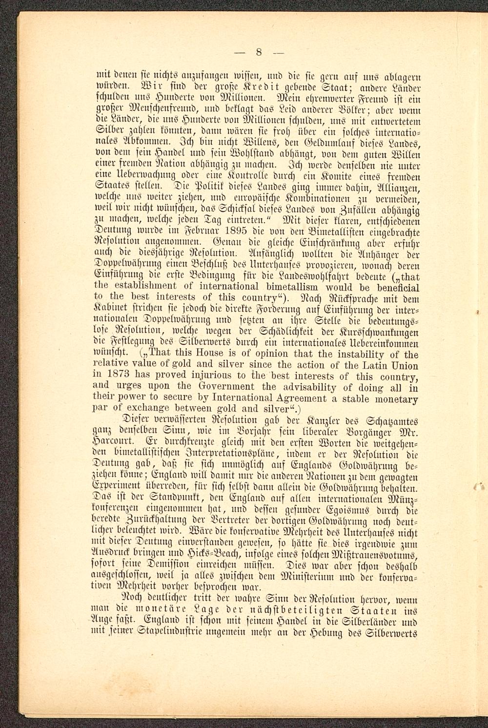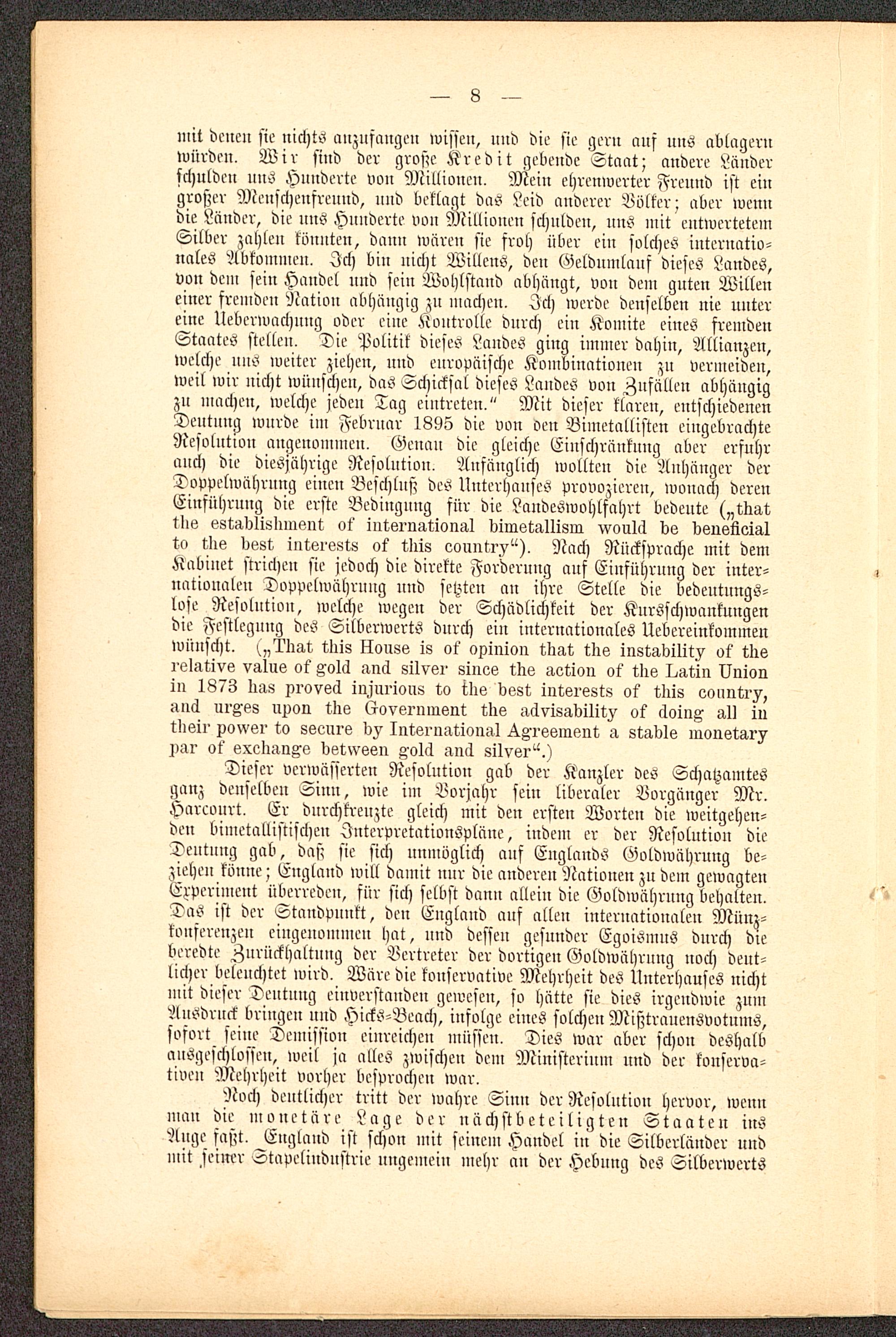 mit dcueu sie nichts anzusaugen ivissen, und die sie gern auf uns ablagernwürden. Wir sind der große Kredit gebende Staut; andere Länderschulden nns Hunderte von Millionen, Mein ehrenwerter Frennd ist eingroßer Menschenfreund, uud verlagt das Leid anderer Böller; aber wenndie Länder, die uns Hunderte von Millionen schulden, nns mit entwertetemSilber zahlen könnten, dann wären sie froh über ein solches internatio-nales Abkommen, Ich bin nicht Willens, den Geldumlauf dieses Landes,von dem sein Handel nnd sein Wohlstand abhängt, von dem guten Willeneiner fremden Nation abhängig zu machen. Ich werde denselben nie untereine lleberwachung oder eine Kontrolle durch eiu Konnte eines fremdenStaates stellen. Die Politik dieses Landes ging immer dahin, Allianzen,welche uns weiter ziehen, und europäische Kombinationen zn vermeiden,weil wir nicht wünschen, das Schicksal dieses Landes von Zufällen abhängigzn machen, welche jeden Tag eintreten," Mit dieser klaren, entschiedenenDentnng wurde im Febrnar 1895 die von oen Bimetallisten eingebrachteResolution augenommeu. Genau die gleiche Einschränknng aber crsnhrmich die diesjährige Resolution, Ansänglich wollten die Anhänger derDoppelwährung einen Beschluß des Unterhauses provozieren, wonach derenEinsnhrung die erste Bedingung siir die Landeswohlfahrt bedeute („tlmt.tilg sstadlislnnsnt ot' iutöi'NÄtiormI dimstallism vvoulä de bsusüeiÄlto t,bs döst inkei'ö8k8 ok iIÜ8 oountry"), ?cach Rücksprache mit demjiabinet strichen sie jedoch die direkte Forderung auf Einführung der inter-nationalen Doppelwährung und setzten an ihre Stelle die bedeutnngs-lose Resolution, welche wegen der Schädlichkeit der Kursschwankungendie Festlegung des SilbcrwertS dnrch ein internationales Uebcreinkommenwünscht, („Äig-t tbis Houss is ok npinion tbat ins instabilit^ ok tlrsrelative valus ot' xolä nncl silvsr sines ins aetion ok tlis I^atin Unionin 1873 lurs xroved injurions ilie best intsrest« ok tliis eonntrv,anÄ urxes UPon tlie Kovernnrent tlre aävisabilitv ok äoin^ all intbeir ponsr to seeure dv Intsrnatioiurl ^xrssinent a Stadls inonstarv^ar ot' exedun^s detwesn g-olcl an<1 silver^.)
