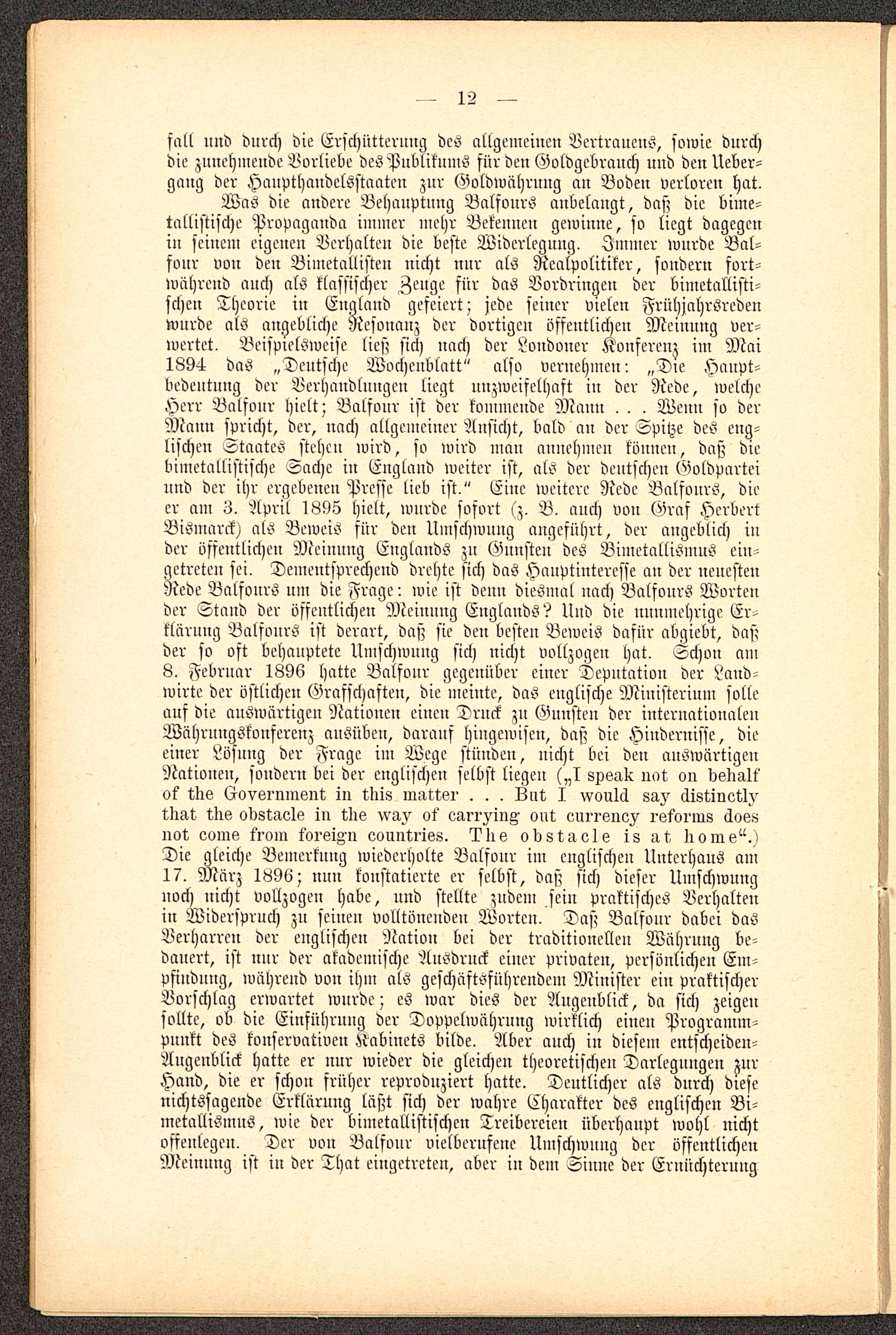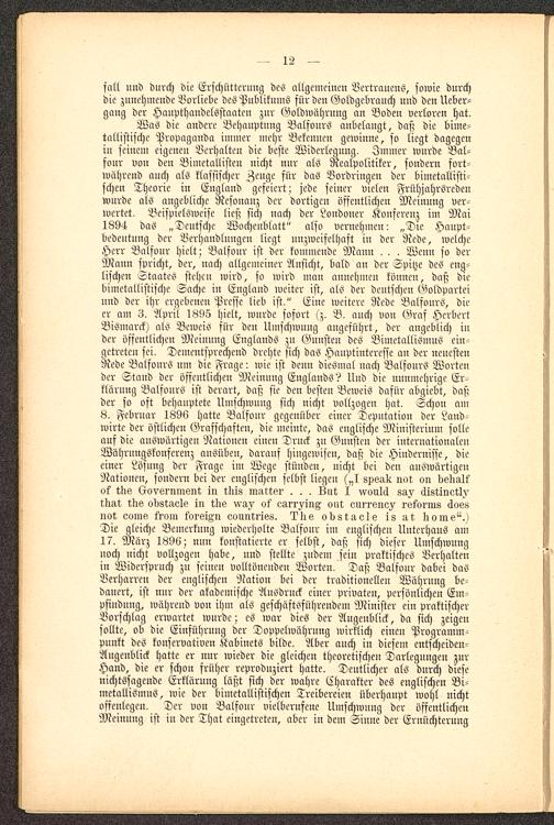 WaS die andere Behauptung Balfonrs anbelangt, daß die bime-tallistische Propaganda iininer mehr Bekennen gewinne, so liegt dagegenin seinem eigenen Verhalten die beste Widerlegung. Immer wurde Bal-four von den Biuietallistcu uicht nur als Realpolitiker, sondern fort-während mich als klassischer Zenge für das Vordringen der bimctallisti-schcn Theorie iu England gefeiert; jede seiner vielen Frühjahrsrcdenwurde als angebliche Resonanz der dortigen öffentlichen Meinung ver-wertet. Beispielsweise lies? sich nach der Londoner Konferenz im Mai1894 das „Deutsche Wochenblatt" also vernehmen' „Die Haupt-bedeutung der Verhaudluugeu liegt unzweiselhast iu der Rede, welcheHerr Balfour hielt; Balsour ist der kommende Mann , , , Wenn so derMann spricht, der, nach allgemeiner Ansicht, bald an der Spitze des eng-lischen Staates stehen wird, so wird man annehmen können, daß diebimetallistische Sache in England weiter ist, als der deutschen Goldparteiund der ihr ergebenen Presse lieb ist," Eine weitere Rede Balfours, dieer am 3. April 1895 hielt, wurde sosort (z. B. auch von Graf HerbertBismarck) als Beweis für den Umschwung angesührt, der angeblich inder öffentlichen Meinung Englands zu Guusteu des Äimetallismus ein-getreten sei. Dementsprechend drehte sich das Hauptinteresse au der neuestenRede Balfours nm die Frage: wie ist denn diesmal nach BalfonrS Wortender Stand der öffentlichen Meinung Englands ? Und die unumehrige Er-klärnng Balfonrs ist derart, daß sie den besten Beweis dafür abgiebt, daßder so oft behauptete Umschwung sich nicht vollzogen hat. Schon am8, Februar 1896 hatte Balfour gegenüber einer Depntation der Land-wirte der östlichen Grasschaften, die meinte, das englische Ministcrinm solleauf die auswärtigen Nationen einen Druck zu Guusteu der internationalenWährungskonferenz ausüben, daraus hiugcwiseu, daß die Hindernisse, dieeiner Lösung der Frage im Wege stünden, nicht bei den auswärtigenNationen, soudern bei der englischen selbst liegen („I sxs»K uat on debült'ok tluz Liovsrnmöirt in Ibis m»ttsr . . , Lut I woulcl ss,^ elistinetlvtblrt ilrs. obst^els iu tbe vvg.^ c>f earr^inK out currency i-stoi'ms äoesnot comk troiu toi-siZ'ii eountriks. ?Iik obstncls is u,t, Iioms^.)Die gleiche Bemerkung wiederholte Balsour im englischen Unterhaus am17, März 1896; uuu konstatierte er selbst, daß sich dieser Umschwungnoch nicht vollzogen habe, und stellte zudem sein praktisches Verhaltenin Widerspruch zn seinen volltönenden Worten, Daß Balfonr dabei dasVerharren der englischen Nation bei der traditionellen Währung be-dauert, ist nur der akademische Ausdruck einer privaten, persönlichen Em-pfindung, während von ihm als gcschäftsführendem Minister ein praktischerBorschlag erwartet wurde; es war dies der Augenblick, da sich zeigensollte, ob die Einführung der Dovpelwährnng wirklich ciueu Programm-pnukt des konservativen ^abinets bilde. Aber auch in diesem cntscheiden-Augenblick hatte er mir wieder die gleichen theoretischen Darlegungen zurHand, die er schon früher reproduziert hatte. Deutlicher als durch diesenichtssagende Ertlärnng läßt sich der wahre Eharakter des englischen Bi-mctallismus, wie der biinetailistischcn Treibereien überhaupt wohl nichtoffenlegen. Der von Balfour vielberufeue Umschwung der öffentlichenMeinung ist iu der That eingetreten, aber in dem Sinue der Ernüchterung