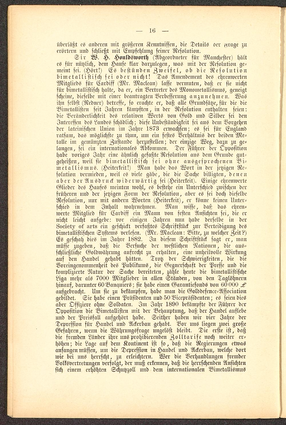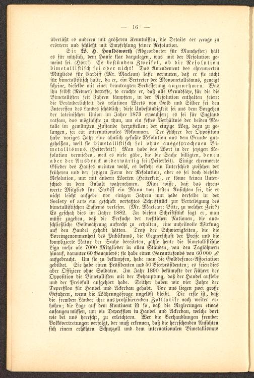 Sir W. H. HouldSworth (Abgeordneter für Manchester ) hältes für nützlich, dem Hanse klar darzulegen, was mit der Resolution ge-meint sei. (Hört!) Es bestünde» Zweifel, ob die Resolutionbim et all istisch sei oder nicht! Das Amendement des ehrenwertenMitglieds für Cnrdiff (Mr. Maclecm) lasse vermuten, daß er sie nichtsür bimetallistisch halte, da er, ein Vertreter des Monometallismus, geneigtscheine, dieselbe mit einer beantragten Verbesserung anzunehmen. Wasihn selbst (Redner) betreffe, so erachte er, daß alle Grundsätze, für die dieBimetallisten seit Iahren kämpften, in der Resolution enthalten seien:die Veränderlichkeit des relativen Werts von Gold und Silber sei denInteressen des Landes schädlich; diese Unbeständigkeit sei ans dem Vorgehender lateinischen Union im Jahre 1873 erwachsen; es sei für England ratfani, das möglichste zu thun, um ein festes Verhältnis der beiden Me-talle im gemüuzteu Zustande herzustellen; der einzige Weg, dazu zu ge-langen, sei ein internationales Abkommen. Der Führer der Oppositionhabe voriges Jahr eine ähnlich gefaßte Resolution ans dem Grnnde gut-geheißen, weil sie bimetallistisch sei ohne ausgesprochenen Bi-metall ismns. (Heiterkeit!) Man habe das Wort in der jetzigen Re-solution vermieden, weil es viele gäbe, die die Sache billigten, denenaber der Ausdruck widerwärtig sei (Heiterkeit). Einige ehrenwerteGlieder des Hauses meinten wohl, es bestehe ein Unterschied zwischen derfrüheren nnd der jetzigen Form der Resolution, aber es sei doch dieselbeResolution, nur mit nudcru Worten (Heiterkeit), er könne keinen Unter-schied iu dem Inhalt wahrnehmen. Mau wisse, das^ das ehren-werte Mitglied sür Cardisf ein Mann von festen Ansichten sei, die ernicht leicht ausgebe: vor einigen Iahreu nun habe derselbe iu derLooist^ ot' arts ein geschickt verfaßtes Schriftstück zur Verteidigung desbiuietalliftischen Systems verlesen. (Mr. Maelean: Bitte, zu welcher Zeit?)Es geschah dies im Jahre 1882. In diesem Schriftstück sagt er, manmüsse zugeben, daß die Versuche der westlichen Nationen, die aus-schließliche Goldwährung ausrecht zu erhalten, eine unheilvolle Wirkungauf den Handel gehabt hätten. Trotz der Schwierigkeiten, die dieBoreingenommenheit des Publikums, die Gegnerschaft der Presse und diekomplizierte Natur der Sache bereiteten, zähle heute die bimetallistischeLiga mehr als 7000 Mitglieder in allen Ständen, von den Taglöhnernhinauf, darunter 60 Bamniiers; sie habe einen Garantiefonds von 60 000aufgebracht. Um sie zu bekämpfen, habe man die Golddefenee-Associationgebildet. Sie habe einen Präsidenten uud 50 Vizepräsidenten; es seien diesaber Offiziere ohne Soldaten. Im Jahr 1890 bekämpfte der Führer derOpposition die Bimetallisteu mit der Behauptung, daß der Handel auflebennd der Preisfall aufgehört habe. Seither haben wir vier Jahre derDepression für Handel nnd Ackerbau gehabt. Bor uns liegen zwei großeGefahren, wenn die Währuugsfrage ungelöst bleibt. Die erste ist, daßdie fremden Länder ihre uns prohibierenden Zolltarife noch weiter er-höhen; die Lage auf dem Kontinent ist so, daß die Regierungen etwasanfangen müssen, um die Depression in Handel nnd Ackerbau, welche dortwie bei nns herrscht, zu erleichtern. Wer die Verhandlungen fremderVolksvertretungen verfolgt, der muß erkennen, daß die herrschenden Ansichtensich einem erhöhten Schutzzoll und dem internationalen Bimetallismns
