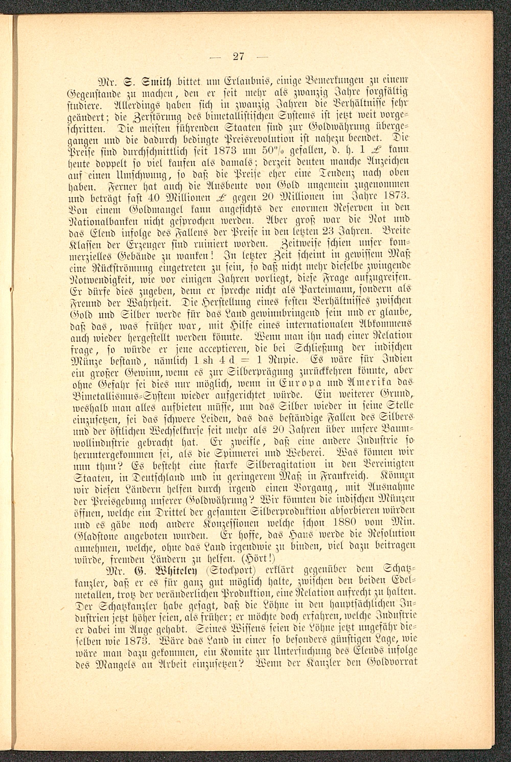 Mr. S, Tmith bittet um Erlaubnis, einigt.' Bemerknngen zu einen»e>'ege»sta»de zn »lachen, de» er seit mebr als zwanzig Jahre sorgfältigstudiere. 'Allerdings yaben sich iu zivanzig Iahren die Verbältnisse sehrgeä»dert', die Zerstörung des bi»ietallistische» ^vste»is ist jetzt weit vorge-schritten. Die meisten sichrenden Staaten sind zur Gold>vähr»»g überge-gangen und die dadurch bedingte Preisrevolntion ist nahezu beendet. DiePreise sind durchschnittlich seit 1873 um 50" ,, gesalleu, d, h, 1 ^' tau»heute doppelt so viel Kufen als damals, derzeit deuten manche Anzeichenauf eiueu llnifclnvuug, so das? die Preise eher eine Tendenz nach obenbabeu, ferner hat auch die 'Ausbeute von <^'old uugemeiu zugenommenund beträgt fast 40 Millionen ^ gegen 2« Millionen im Jahre >873.Von einem Goldmangel kann angesichts der enormen Reserven iu denNationalbanken nicht gesprochen werden, 'Aber grast war die Not unddas Elend infolge des Ballens der Preise in den letzten 2.-! Iahreu, breiteAtlassen der Erzenger sind ruiniert worden, Zeitmeise schien unser kom-merzielles (Gebäude zn ivaukeu! Iu letzter .^cit scheint iu gewissem Masteine Rnckströmnng eingetreten zu sein, so das; nicht mehr dieselbe zwingendeNotwendigkeit, wie vor einigen Jahren vorliegt, diese svrage anszngreisen.Er dürfe dies zugeben, denn er spreche nicht als Parteimauu, sondern alsfreund der Wahrheit, Die Herstellung eines sesteu Verhältnisses zwischenGold und ?ilber werde für das Land gewiuubriugeud sciu uud er glaube,dast das, ivas früher war, mit Hilfe eines internationalen Abkommensauch wieder hergestellt Vierden könnte, Wenn mau ihn nach einer Relationsrage, so würde er jene aeceptieren, die bei Zchliestuug der indischenMünze bestand, nämlich 1 8>i 4 <I — 1 Rnpie, Es wäre snr Indienein großer Gewinn, wcuu es znr 5ilberpräg»ng znrückkehren könnte, aberohne Gefahr sei dies mir möglich, wenn in Europa uud Amerika dasVimetallismiis-^nstem wieder aufgerichtet würde. Ein weiterer Grund,weshalb man alles aufbieten müsse, nm das Silber wieder in seine stelleeinzusetzen, sei das schwere Veiden, das das beständige fallen des Silbersuud der östlichen Wechselkurse seit mehr als 20 Iahren über unsere Vnum-wollindnstrie gebracht hat. Er zweiste, das; eine andere Industrie soheruutergekommeu sei, als die Spinnerei uud Weberei, Was tonneu wirmm thnn? Es besteht eine starke Silberagitarion iu de» Vereinigte»Staaten, i» Teutschland uud iu geringerem Mast in Frankreich , könnenwir diesen Ländern Helsen durch irgend eiueu Vorgang, mit Ausuahmeder Preisgebuug unserer l^oldivährnng? Wir könnten die indischen Münzenössnen, welche ein Drittel der gesamten Silberproduttion absorbieren würdenund es gäbe noch andere Konzessionen welche schon 1880 vom Min,O'ladswne angeboten wurden. Er hoffe, das Haus werde die Resolutionannehmen, welche, ohne das Vand irgendwie zu binden, viel dazu beitragenwürbe, sremdeu Vänderu zu helfen, (Hort!)