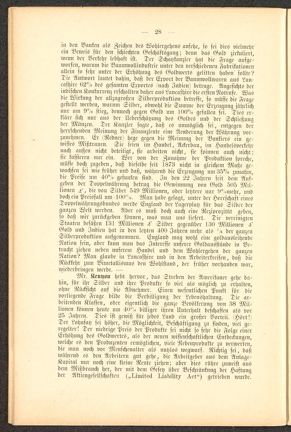 in den Banken als Zeichen des Wohlergehens ansehe, so sei dies vielmehrein Beweis für den schlechte» Geschästsgangdenn das t^'old zirkuliert,ivenn der Verkehr lebhast ist. Ter Schavtanzler hat die ,^rage ansge-worsen, >varnm die Bannnvollindnstrie nnter den verschiedenen Fabrikationenallein so sehr nnter der Erhöhung des Goldwerts gelitten haben sollte?Die Antwort lautet dahin, das? der Erport der Banmwollwarcn anS Vaneashire 62°/o des gesamten Exportes mach Indien) betrage. Angesichts derindischen .Konkurrenz erschallten daher aus Vaucafhire die ersten '.Icotrnfe. Wasdie Wirkung der allzngroßen Silbcrprodnktion betreffe, so müsse die Iragegestellt werden, warum Silber, olnvohl die Snmme der Erzengnng jährlicljnur uni 9"/o stieg, dennoch gegen O'old nm 100"/» gesallen sei. Dies er-kläre sich nnr ans der Ueberschäl.mng des Woldes und der Schließnngder Minsen, Der .Kanzler sagte, das; es unmöglich sei, entgegen derherrschenden Meinnng der «vinanzlente eine Aendernng der Währung vor-zunehmen. Er -Redner) hege gegen die Meinnng der Bankiers ein ge-wisses Misttranen. Sie seien im Handel, Ackerbau, im Handelsverkehrnach austcu nicht beteiligt, sie arbeiten nicht, sie svinnen auch nicht isie kassieren nur ein. Wer von der Znuahme der Produktion spreche,müsse doch zugeben, daß dieselbe seit 1873 uicht in gleichem Maße gewachsen sei wie früher nnd dnst, während die Erzeugung mn 35"/» znnahm,die Preise um 40°>i gesunken sind. In den 22 Jahren seit dem Aus-geben der Doppelwährung betrug die (Gewinnung von (">wld 505 Mil-lionen , die von Silber 549 Acillionen, oder levtere nnr 9" „mehr, unddoch ein Preissall nm 100"». Man habe gesagt, nnter der Herrschaft einesDopvelivährnngsbnndes werde England der Vagerplav sür das Silber derganzen Welt werden. '.'Iber es mnst doch auch eine Reziprozität geben,so dast nur znrückgeben können, was man nns liefert. Die vereinigtenStaaten besäßen 131 Millionen ^' 5ilber gegenüber 130 Millionen ^(^'old nnd Indien hat in den letzten 400 Jahren mehr als ° ° der ganzenSilbcrprodnktion ansgenommen. England mag ivohl eine goldansleihende'.>cation sein, aber kann man das Interesse unserer ^'oldansstände in Be-tracht ziehen neben unserem Handel nnd dem Wohlergehen der ganzenNation? Man glaube iu Vanenshire uud iu deu Arbeiterkreisen, dast dieRückkehr zum Bimetallismns den Wohlstand, der srüher vorhanden ivar,wiederbringen werde. —
