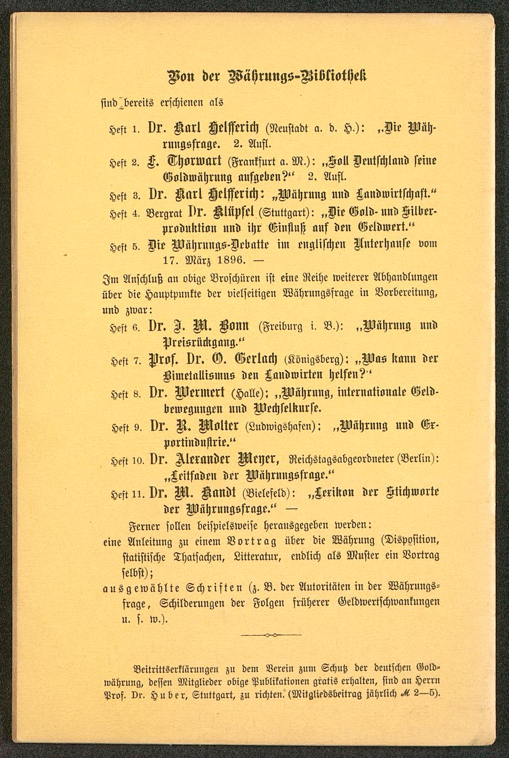 Beitrittserklärungen zu dem Verein zum Schutz der deutschen Gold-währung, dessen Mitglieder obige Publikationen gratis erhalten, sind an HerrnProf. Dr. Huber, Stuttgart , zu richten. (Mitgliedsbeitrag jährlich ^ 2—S).