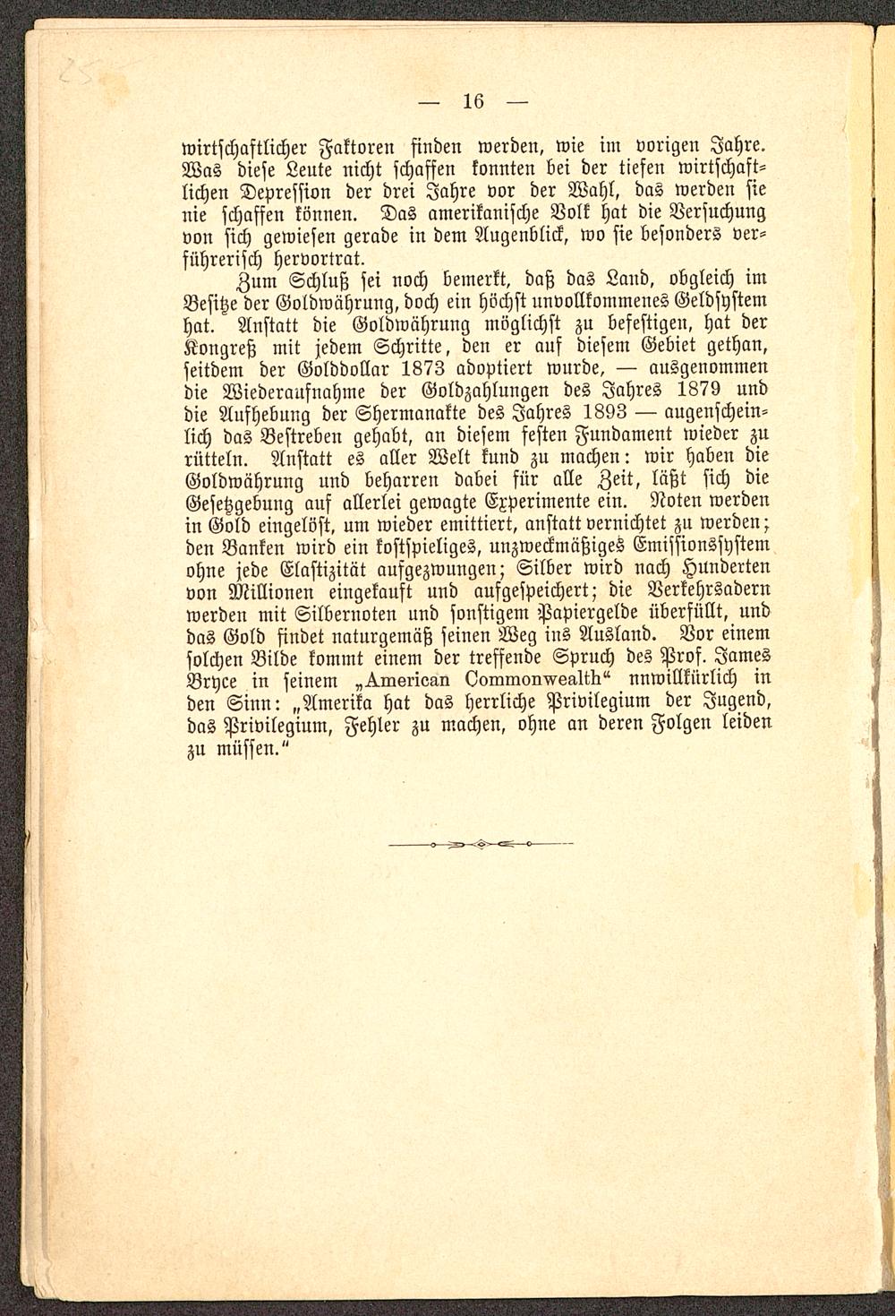 Zum Schluß sei noch bemerkt, daß das Land, obgleich imBesitze der Goldwährung, doch ein höchst unvollkommenes Geldsystemhat. Anstatt die Goldwährung möglichst zu befestigen, hat derKongreß mit jedem Schritte, den er auf diesem Gebiet gethan,seitdem der Golddollar 1873 adoptiert wurde, — ausgenommendie Wiederaufnahme der Goldzahlungen des Jahres 1879 unddie Aufhebung der Shermanakte des Jahres 1893 — augenschein-lich das Bestreben gehabt, an diesem festen Fundament wieder zurütteln. Anstatt es aller Welt kund zu machen: wir haben dieGoldwährung und beharreu dabei für alle Zeit, läßt sich dieGesetzgebung auf allerlei gewagte Experimente ein. Noten werdenin Gold eingelöst, um wieder emittiert, anstatt vernichtet zu werden;den Banken wird ein kostspieliges, unzweckmäßiges Emissionssystemohne jede Elastizität aufgezwungen; Silber wird nach Hundertenvon Millionen eingekauft und aufgespeichert; die Verkehrsadernwerdeu mit Silberuoten und sonstigem Papiergelde überfüllt, unddas Gold findet naturgemäß seinen Weg ins Ausland. Vor einemsolchen Bilde kommt einem der treffende Spruch des Prof. JamesBryce in seinem ^^.msrioan (Zoinmoll^saltli^ nnwillkürlich inden Sinn: „Amerika hat das herrliche Privilegium der Jugend,das Privilegium, Fehler zu machen, ohne an deren Folgen leidenzu müssen."