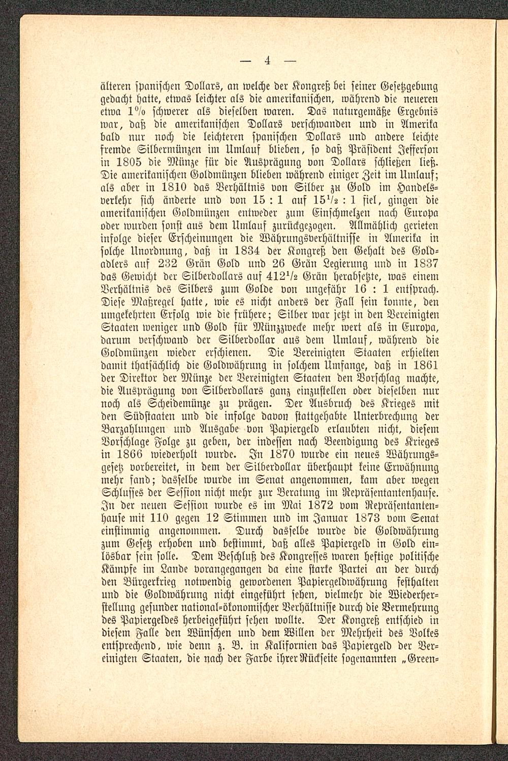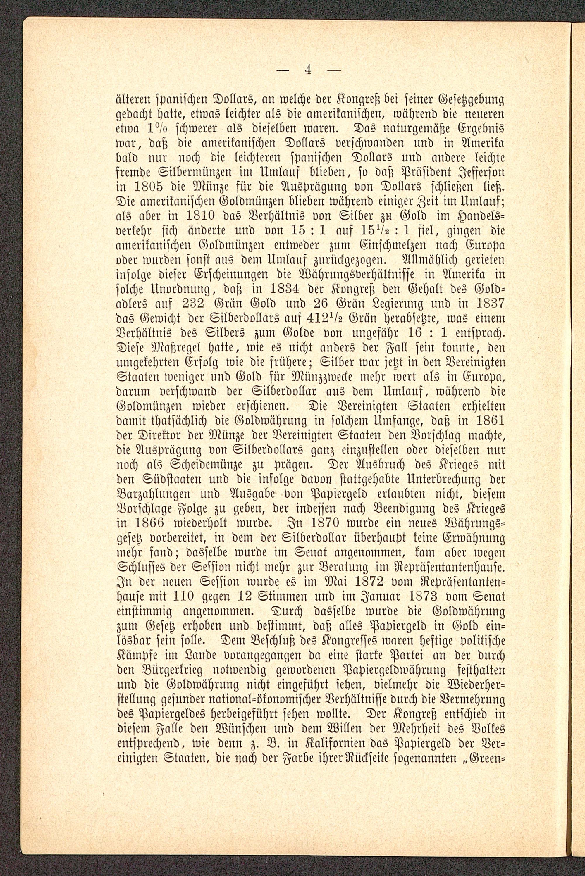 älteren spanischen Dollars, an welche der Kongreß bei seiner Gesetzgebunggedacht hatte, etwas leichter als die amerikanischen, während die neuerenetwa 1°/o schwerer als dieselben waren. Das naturgemäße Ergebniswar, daß die amerikanischen Dollars verschwanden und in Amerika bald nur noch die leichteren spanischen Dollars und andere leichtefremde Silbermünzen im Umlauf blieben, so daß Präsident Jeffersonin 1805 die Münze für die Ausprägung von Dollars schließen ließ.Die amerikanischen Goldmünzen blieben während einiger Zeit im Umlauf;als aber in 1810 das Verhältnis von Silber zu Gold im Handels-verkehr sich änderte und von 15 : 1 auf 15'/2 : 1 fiel, gingen dieamerikanischen Goldmünzen entweder zum Einschmelzen nach Europa oder wurden sonst aus dem Umlauf zurückgezogen. Allmählich gerieteninfolge dieser Erscheinungen die Wührungsverhältnisse in Amerika insolche Unordnung, daß in 1834 der Kongreß den Gehalt des Gold-adlers auf 232 Grün Gold und 26 Grän Legierung und in 1837das Gewicht der Silberdollars auf 412V-- Grün herabsetzte, was einemVerhältnis des Silbers zum Golde von ungefähr 16 : 1 entsprach.Diese Maßregel hatte, wie es nicht anders der Fall sein konnte, denumgekehrten Erfolg wie die frühere; Silber war jetzt in den VereinigtenStaaten weniger und Gold für Münzzwecke mehr wert als in Europa ,darum verschwand der Silberdollar aus dem Umlauf, während dieGoldmünzen wieder erschienen. Die Vereinigten Staaten erhieltendamit thatsächlich die Goldwährung in solchem Umfange, daß in 1861der Direktor der Münze der Vereinigten Staaten den Vorschlag machte,die Ausprägung von Silberdollars ganz einzustellen oder dieselben nurnoch als Scheidemünze zu prägen. Der Ausbruch des Krieges mitden Südstaaten und die infolge davon stattgehabte Unterbrechung derBarzahlungen und Ausgabe von Papiergeld erlaubten nicht, diesemVorschlage Folge zu geben, der indessen nach Beendigung des Kriegesin 1866 wiederholt wurde. In 1870 wurde ein neues Währungs-gesetz vorbereitet, in dem der Silbcrdollar überhaupt keine Erwähnungmehr fand; dasselbe wurde im Senat angenommen, kam aber wegenSchlusses der Session nicht mehr zur Beratung im Repräsentautcnhause.In der neuen Session wurde es im Mai 1872 vom Reprüseutanten-hause mit 116 gegen 12 Stimmen und im Januar 1873 vom Senateinstimmig angenommen. Durch dasselbe wurde die Goldwährungzum Gesetz erhoben und bestimmt, daß alles Papiergeld in Gold ein-lösbar sein solle. Dem Beschluß des Kongresses waren heftige politischeKämpfe im Lande vorangegangen da eine starke Partei an der durchden Bürgerkrieg notwendig gewordenen Papiergeldwährung festhaltenund die Goldwährung nicht eingeführt sehen, vielmehr die Wiederher-stellung gesunder national-ökonomischer Verhältnisse durch die Vermehrungdes Papiergeldes herbeigeführt sehen wollte. Der Kongreß entschied indiesem Falle den Wünschen und dem Willen der Mehrheit des Volkesentsprechend, wie denn z. B. in Kalifornien das Papiergeld der Ver-einigten Staaten, die nach der Farbe ihrer Rückseite sogenannten „Green -