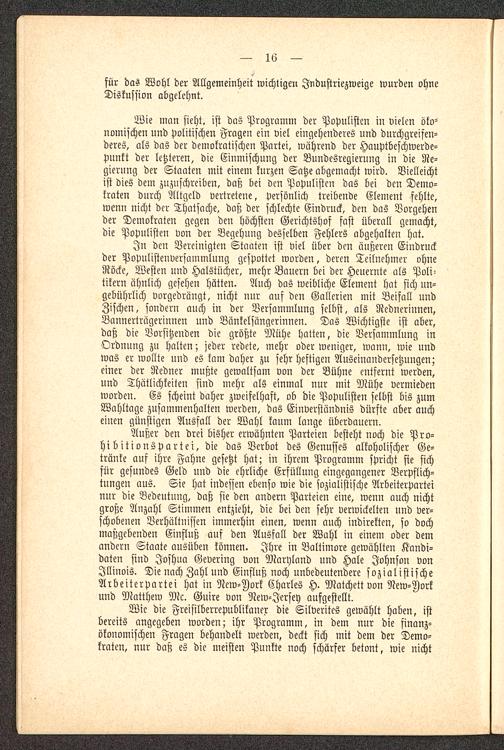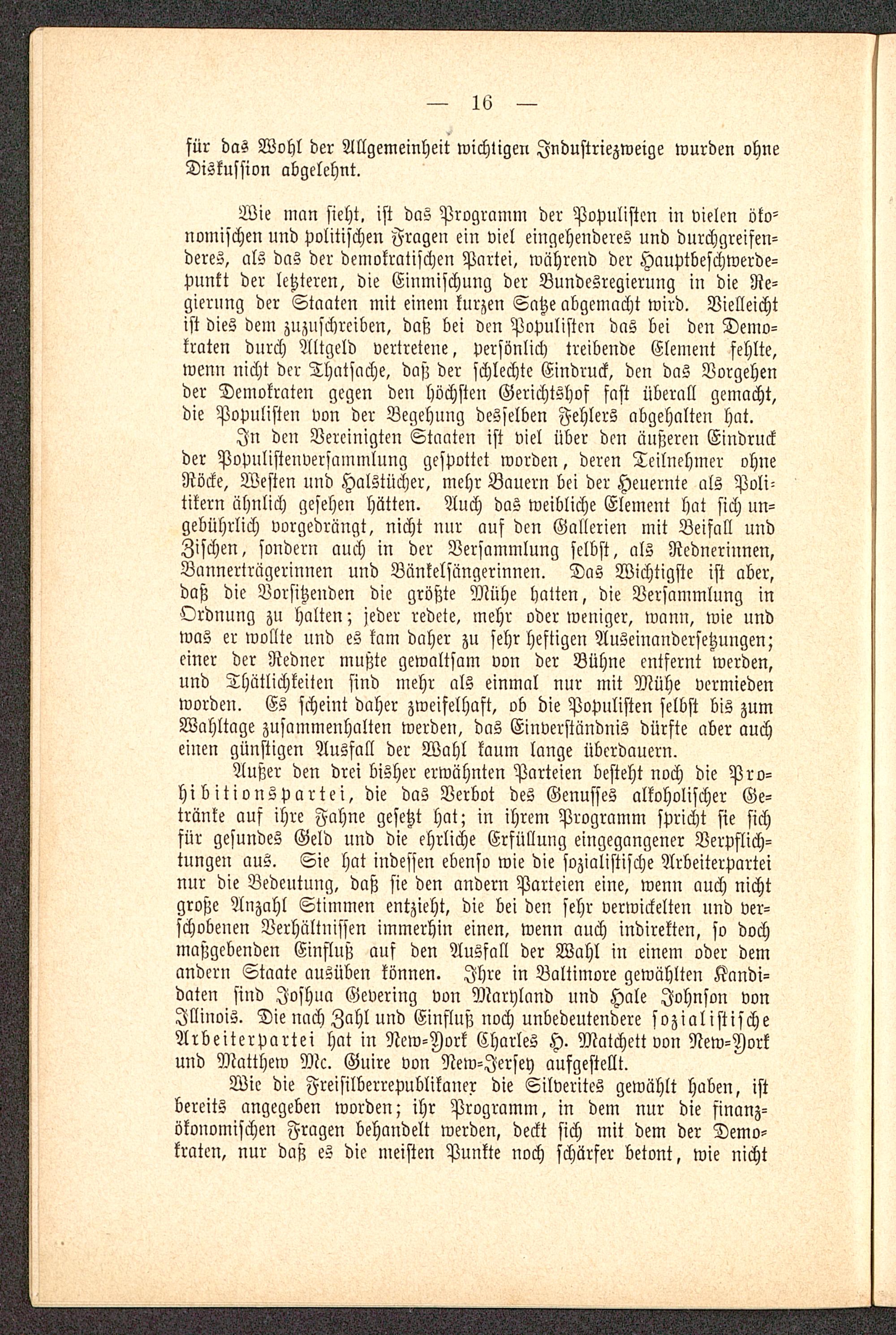 Wie die Freisilberrepublikaner die Silverites gewühlt haben, istbereits angegeben worden; ihr Programm, in dem nur die finanz-ökonomischen Fragen behandelt werden, deckt sich mit dem der Demo-kraten, nur daß es die meisten Punkte noch schärfer betont, wie nicht